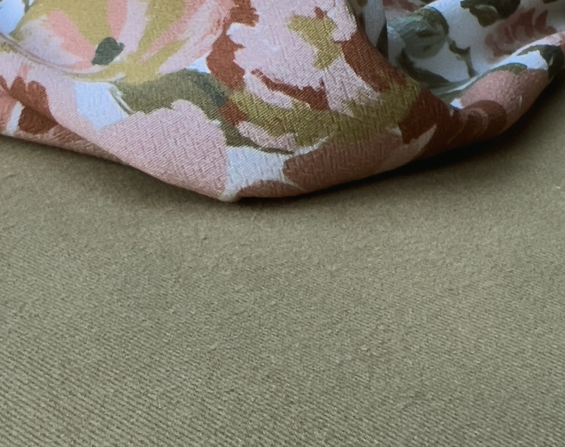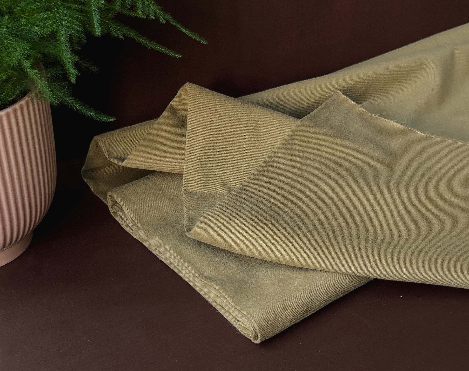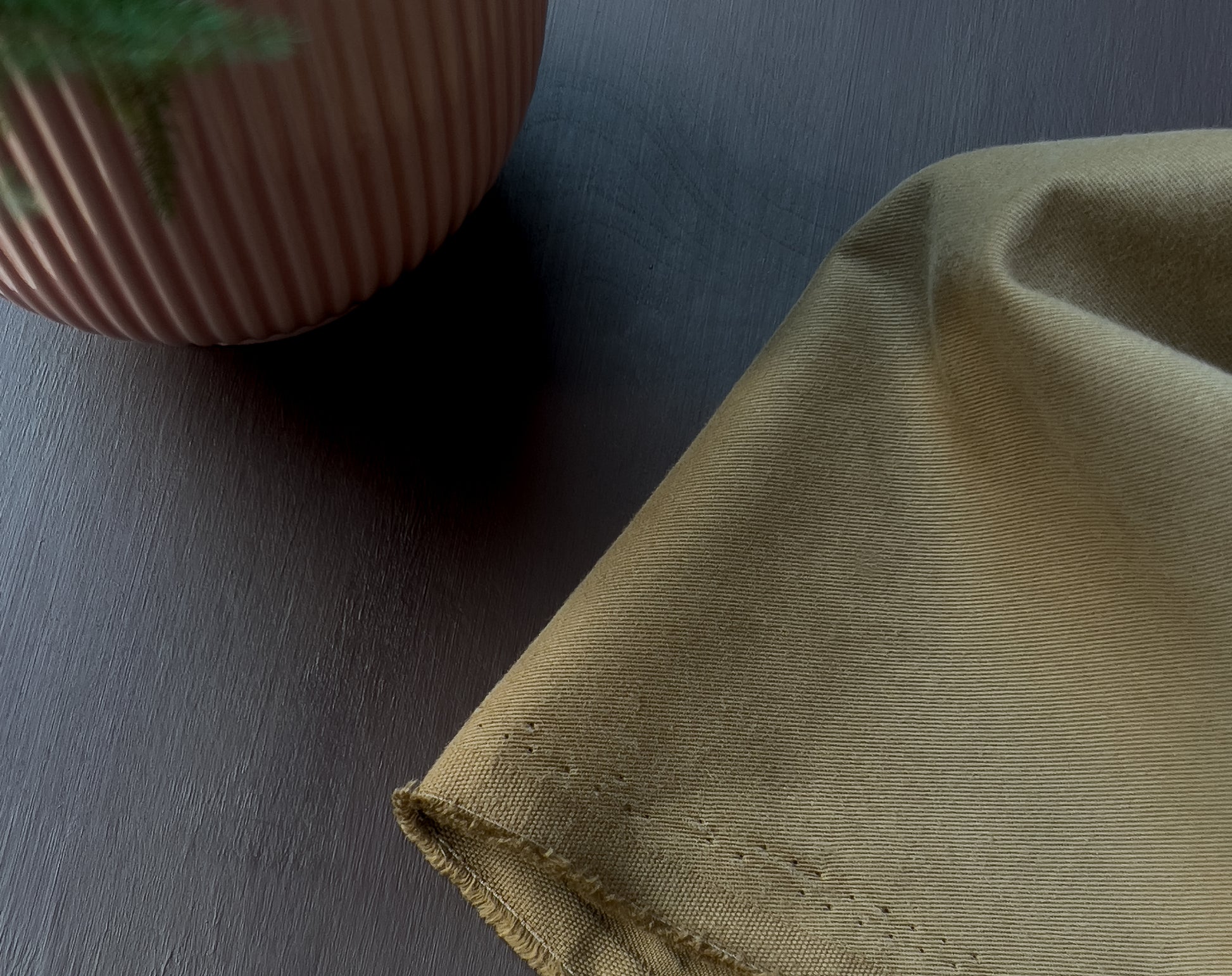A soft and smooth light but densely woven twill fabric, with a peach skin 'brushed' finish on the face side. This has a delicate edge to it, not like some heavier twills. The amazing shade of olive comes from La Maison's exclusive colour chart, the earthiness does actually make me think of a jar of olives! There is also the same fabric in another shade called ‘Légère Laurier’.