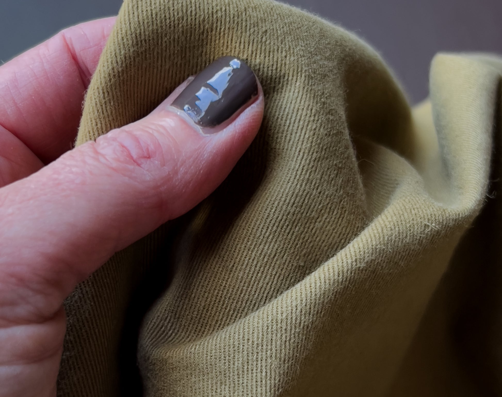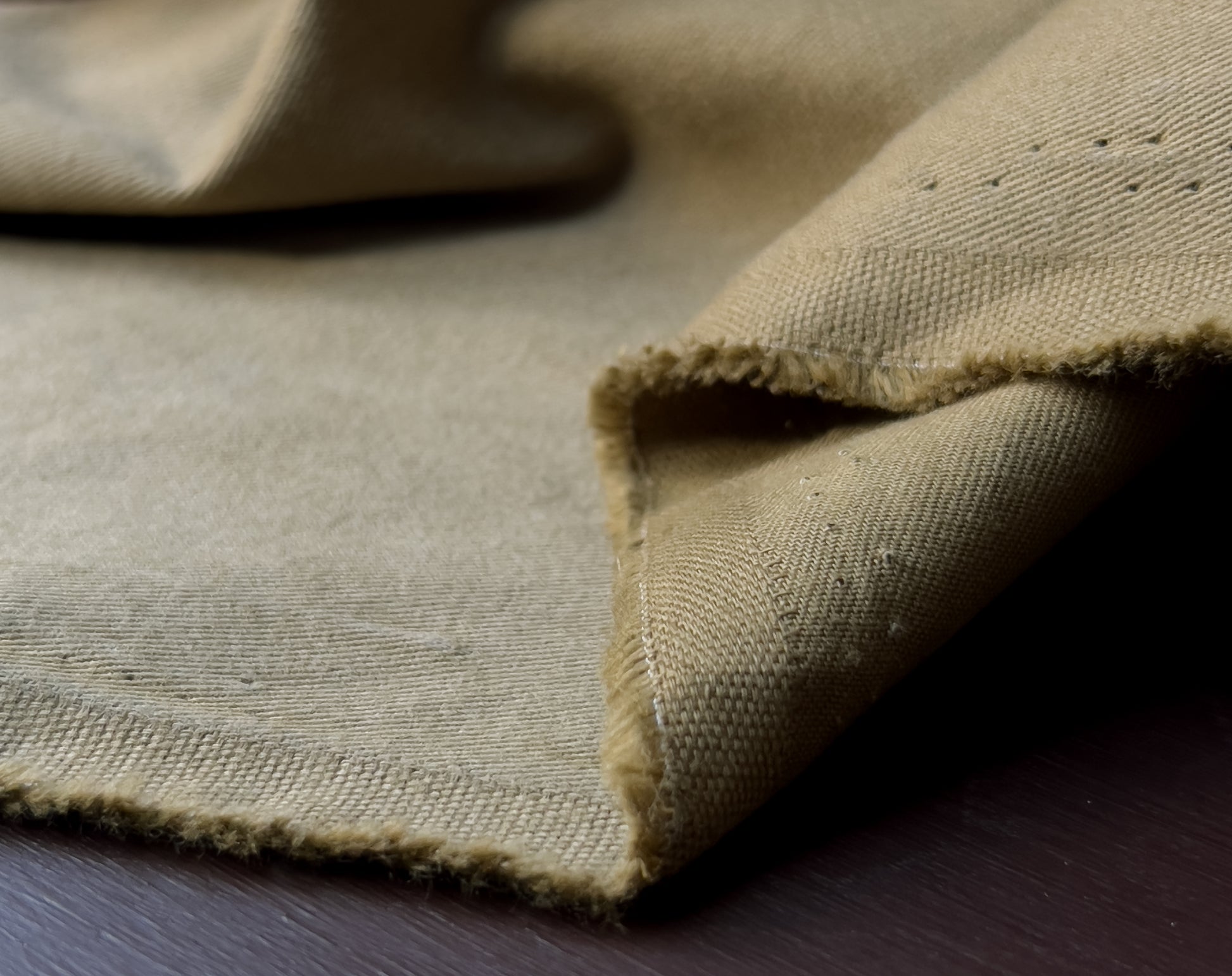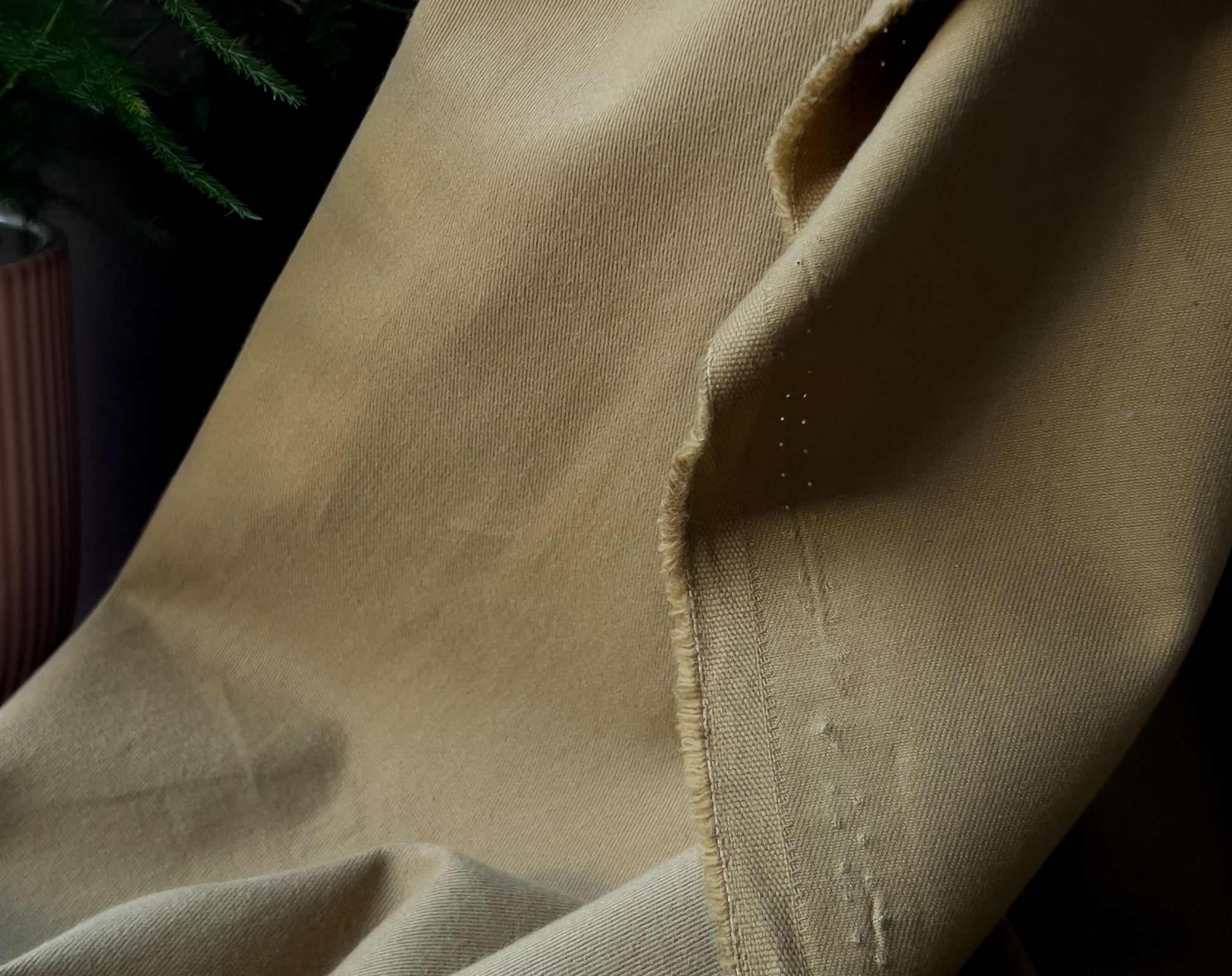 A soft and smooth light but densely woven twill fabric, with a peach skin 'brushed' finish on the face side. This has a delicate edge to it, not like some heavier twills. The amazing shade of olive comes from La Maison's exclusive colour chart, the earthiness does actually make me think of a jar of olives! There is also the same fabric in another shade called ‘Légère Laurier’.
