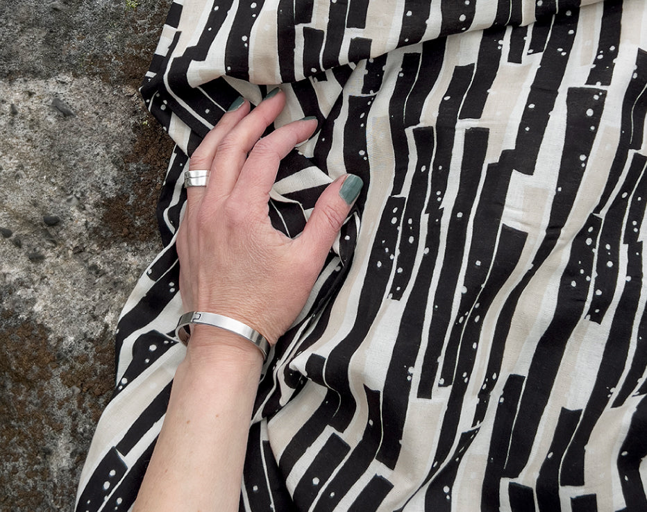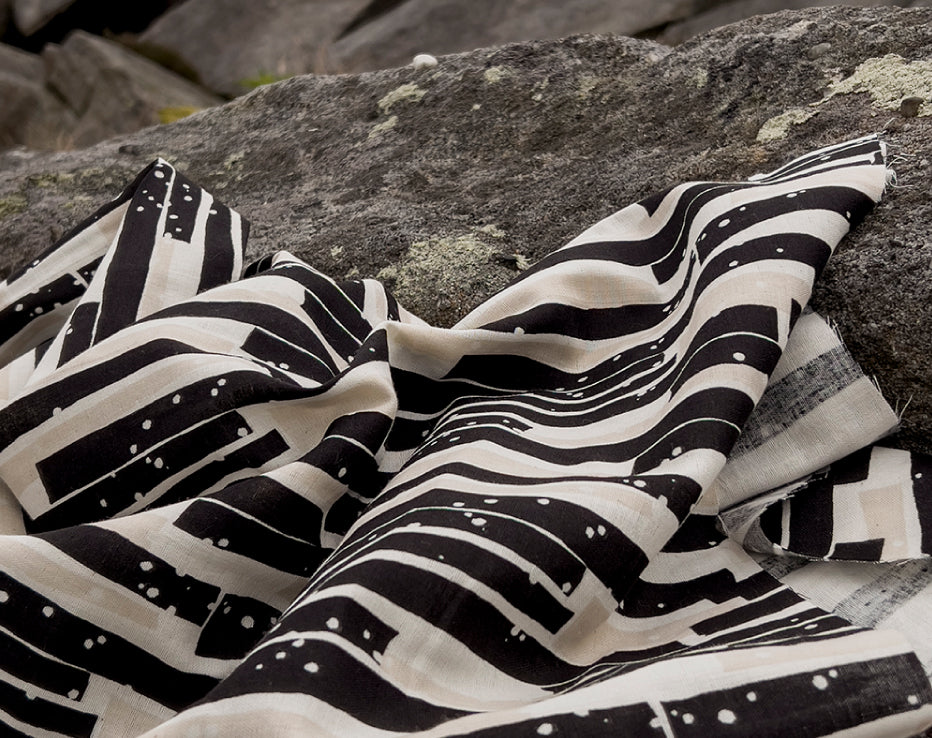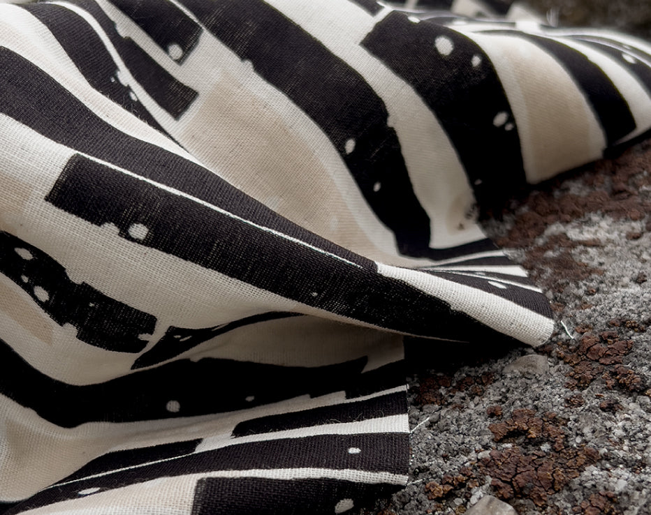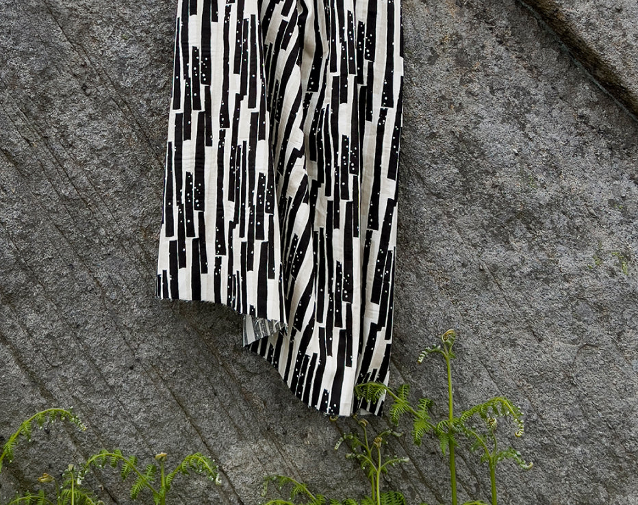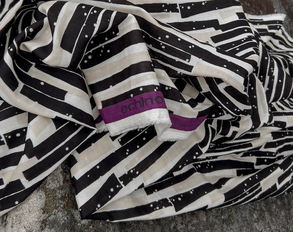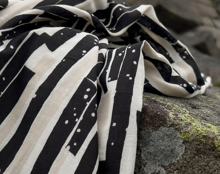 Bringing another wonderful double gauze to our collection for Summer by Kokka Echino. Double gauze has a wonderful airy feel consisting of two layers of light voile pin stitched together. It has quite a relaxed feel perfect for most styles of clothing, working well for achieving volume on even the most simple designs. A simply beautiful fabric with a fresh and timeless edge to it, I love the vertical abstract stripes which have a block print look about them, and nice wearable neutral tones.