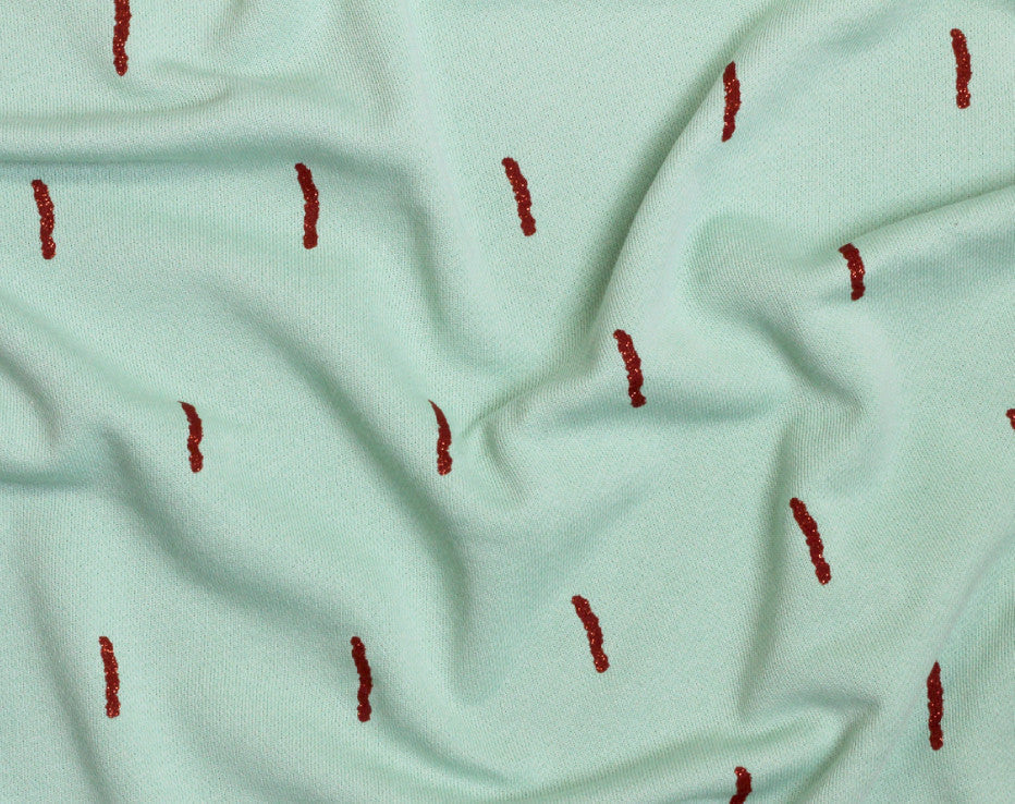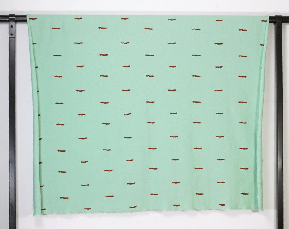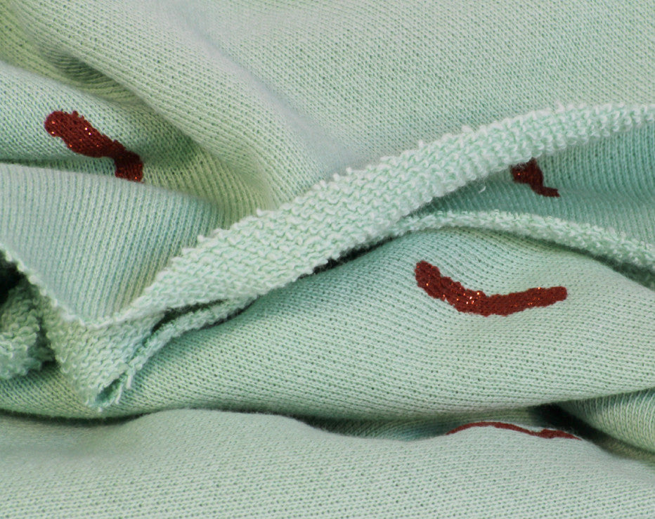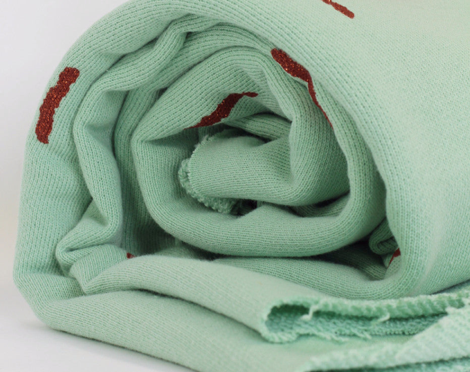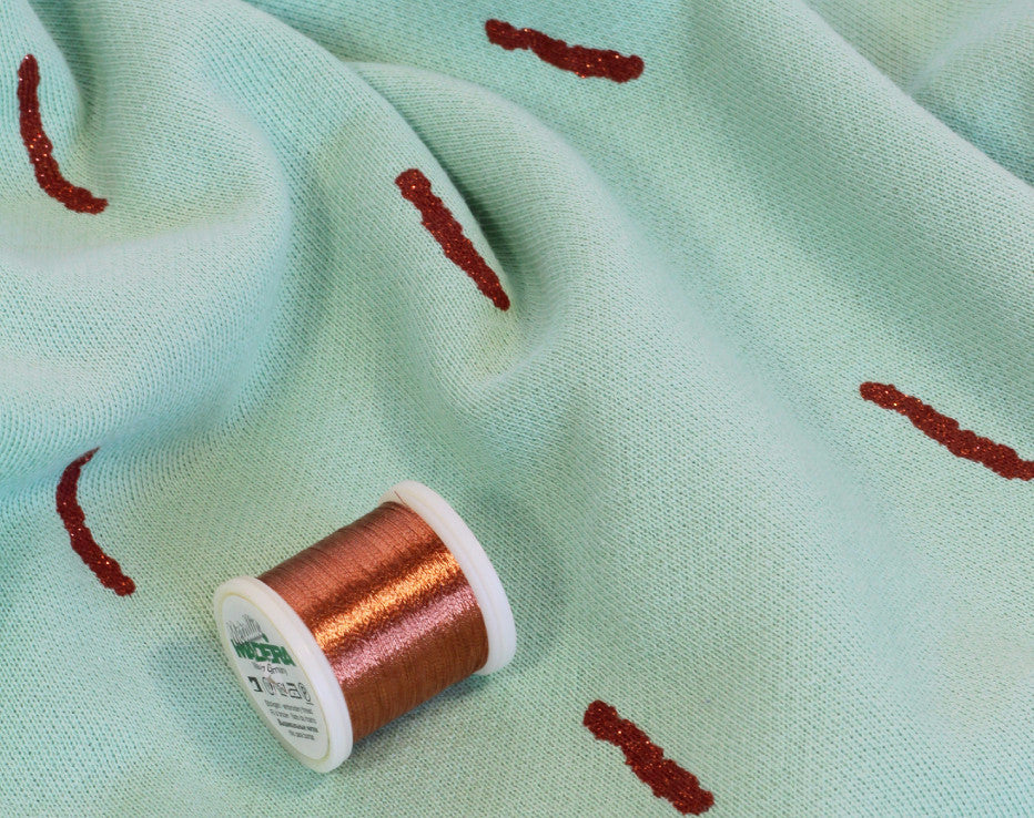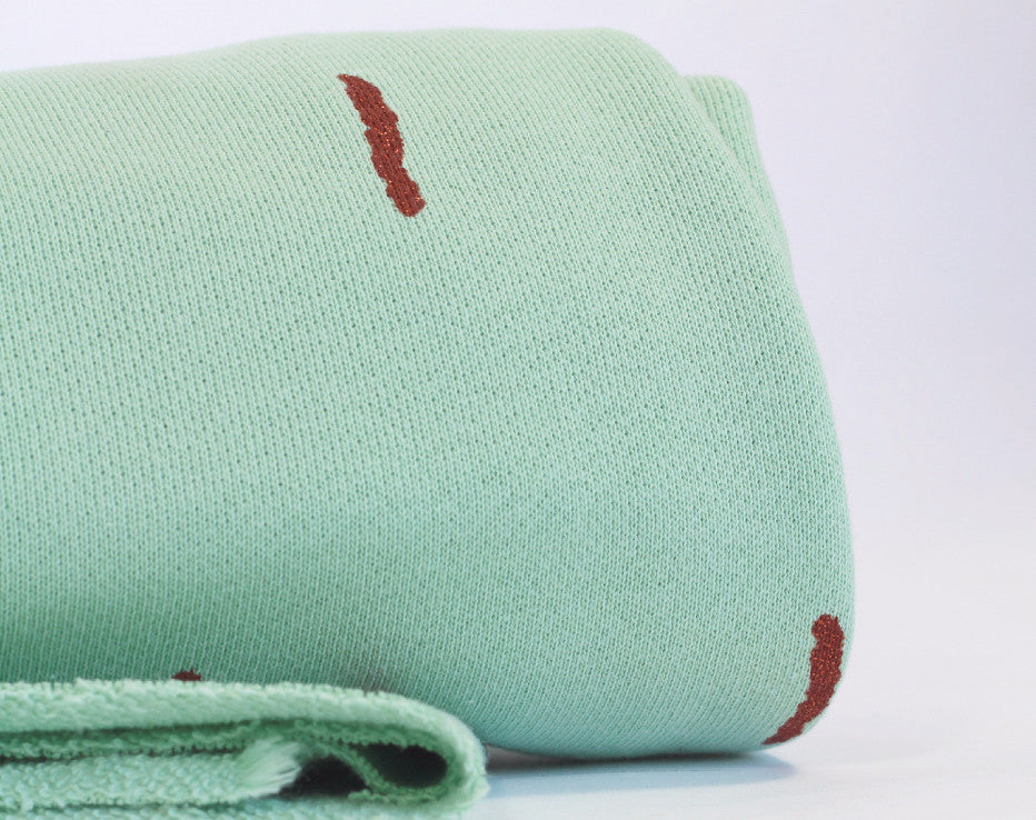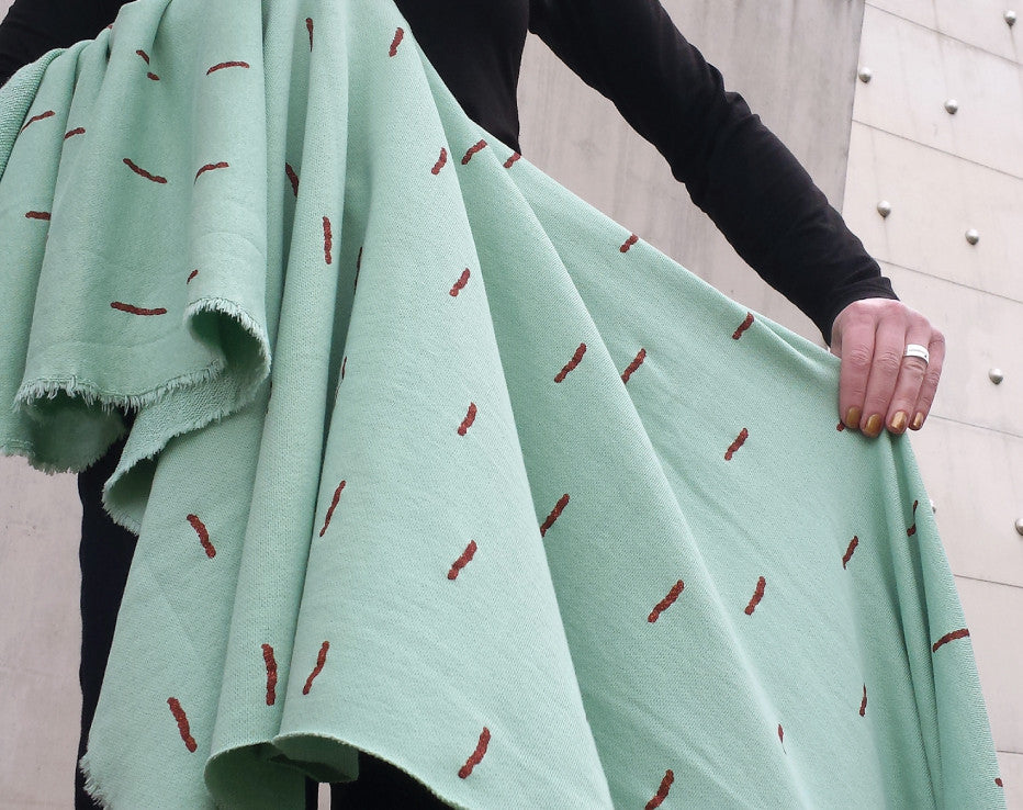 Welcome to our, new and exclusive in the UK, very cool brand fresh out of Antwerp! I mean what is there to say? It’s a copper print! This fabric is a Spring delight and on discovering this awesome new designer Chat Chocolat, it was decision made for me. The copper sparkle sticks pattern is printed on a sumptuous stretch sweat knit and has a loop ‘terry style’ back. There’s a slightly looser weave in this fabric than a standard sweatshirting and quite cosy, perfect for the ever so classic Linden sweatshirt pattern, though I’m already thinking of a pencil skirt for the summer. That’s right, you heard it from me first, Fiona of Faberwood does actually wear skirts! This is a perfect 100% organic knit fabric, designed by Véronique Vereyken of Chat Chocolat maker of her own clothes straight from the city of fashion!