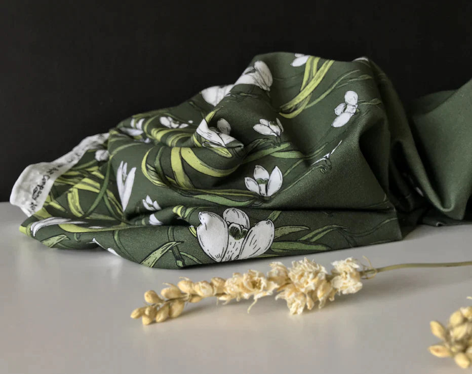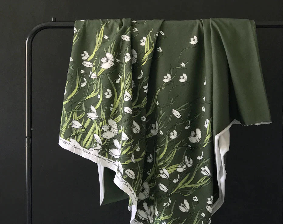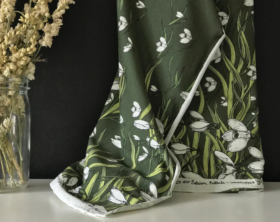 Lumikellokuja means 'Snowdrop Alley' from The Secret Garden collection by Nuppu, featuring artist Satu Kontinen. My favourite thing about this design is the large area of solid colour, which you could work into your project creating interesting clothing. This fabric has a firm hold to the stretch due to the right amount of elastane added. The feel is quite soft and almost satin-like, hangs heavy so if you want drape too it would be excellent for something like a dress. The Finland jerseys are always excellent to sew with, nice and strong without all that wave you can get with some stretch fabrics. If you wanted to sew something more fitted I think you'd be pleased with the solid structure that will be figure forming, plus it's nice and wide too which is a common theme with these fabrics.
