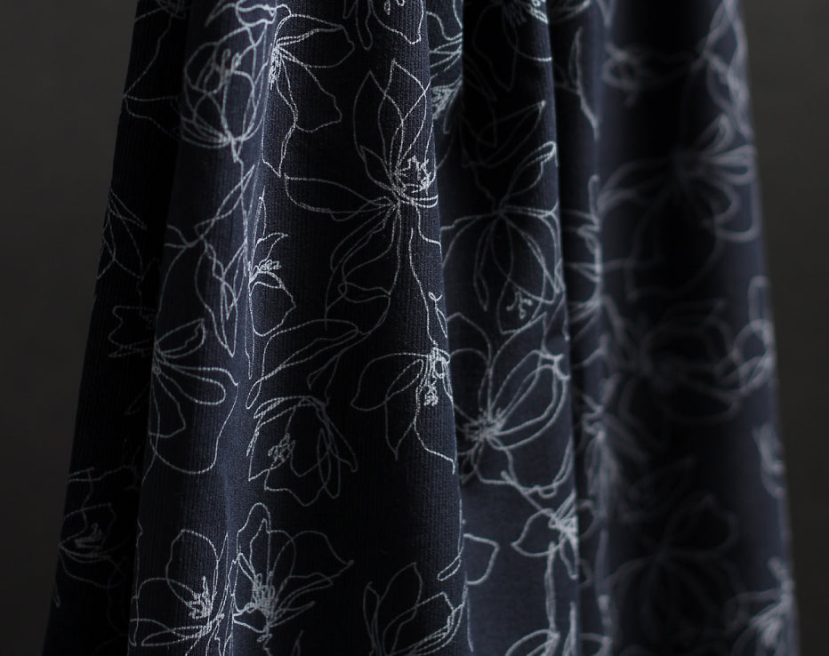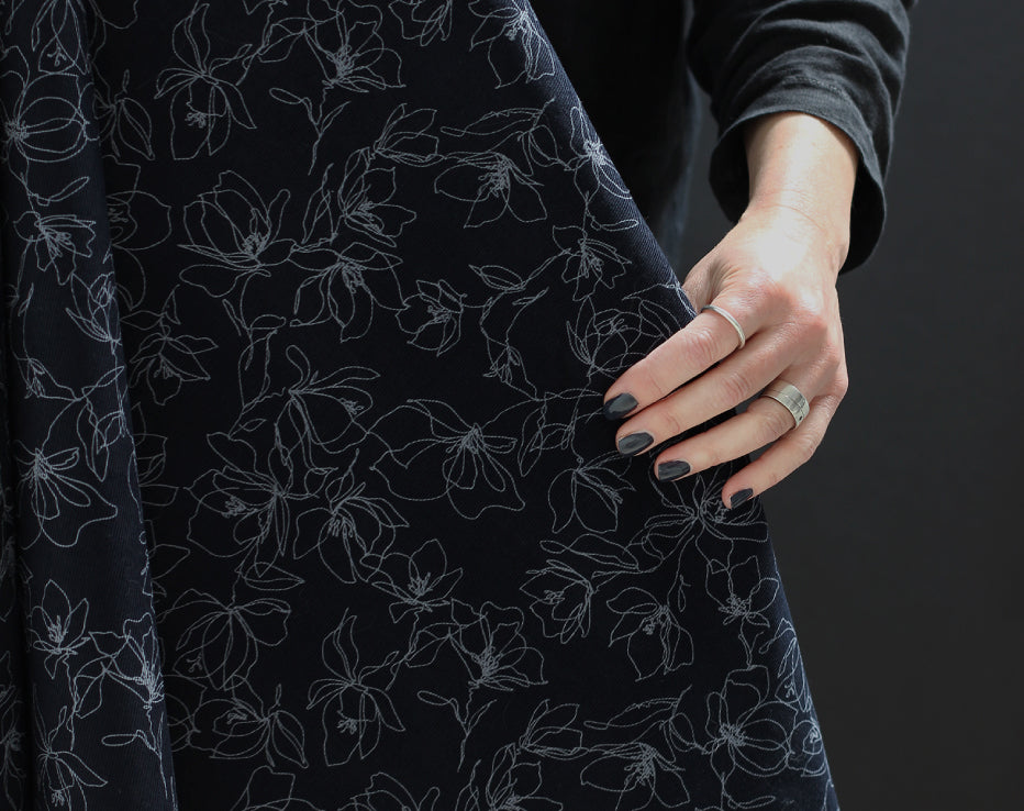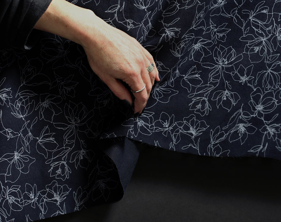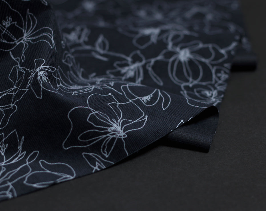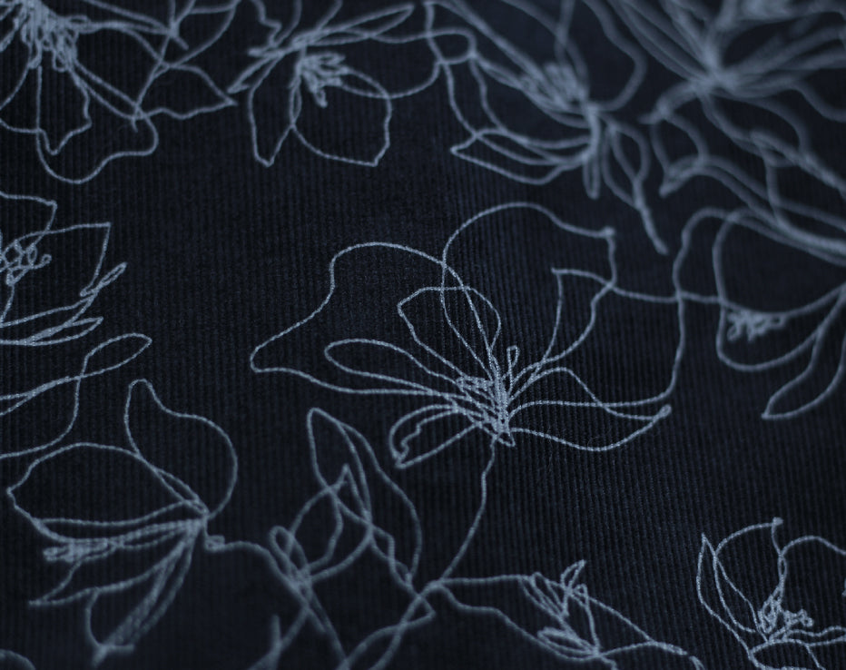A wonderful quality fine wale corduroy by Japanese brand Hokkoh. This beautiful fluid floral design on a deep navy base creates a lovely abstract effect.