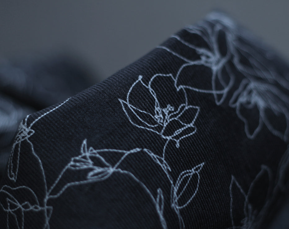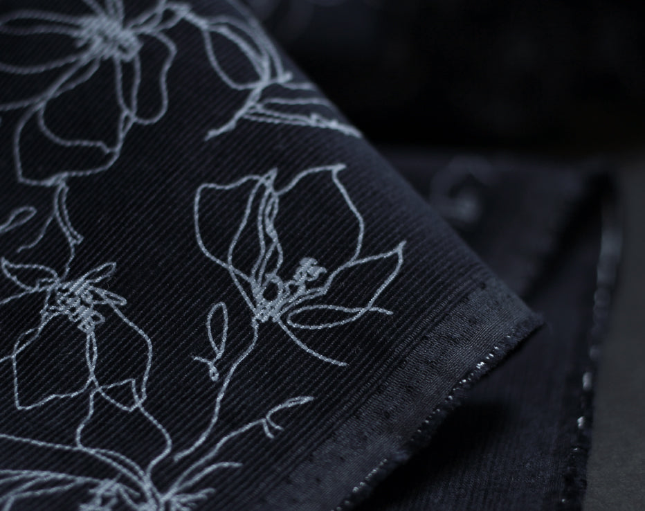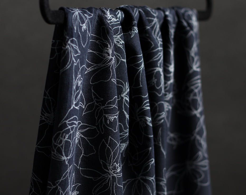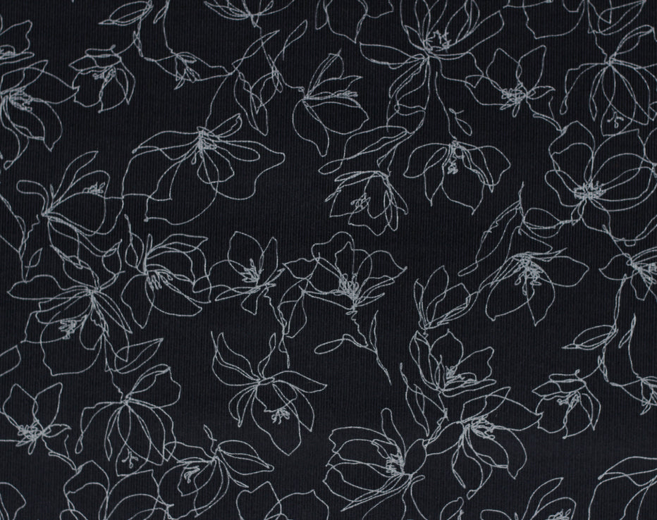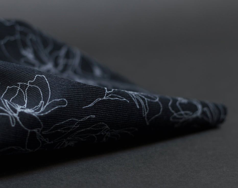 A wonderful quality fine wale corduroy by Japanese brand Hokkoh. This beautiful fluid floral design on a deep navy base creates a lovely abstract effect.
