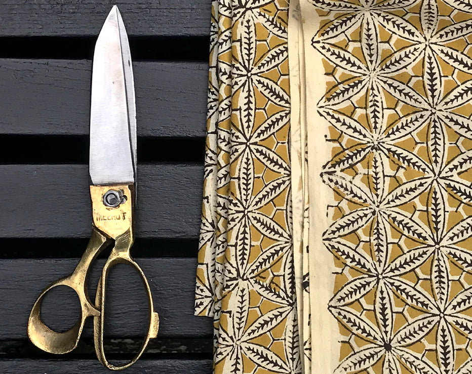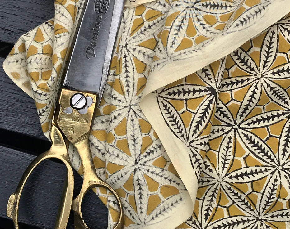 I searched for something a little more traditional from India and I think I've found it. A dreamy, soft and lightweight cotton print featuring a stunning repeat of pretty star floral shapes. These block prints only come in limited amounts so the styles are rarely repeated. The family-run textile businesses in India produce unique one-off designs using all plant-based dyes. Dried by the heat of the sun, these textiles produce colours have a different edge to a more commercially produced print, for instance, the black has a dark chocolate tone to it. This fabulous earthy shade of deep gold sits beautifully with this design.