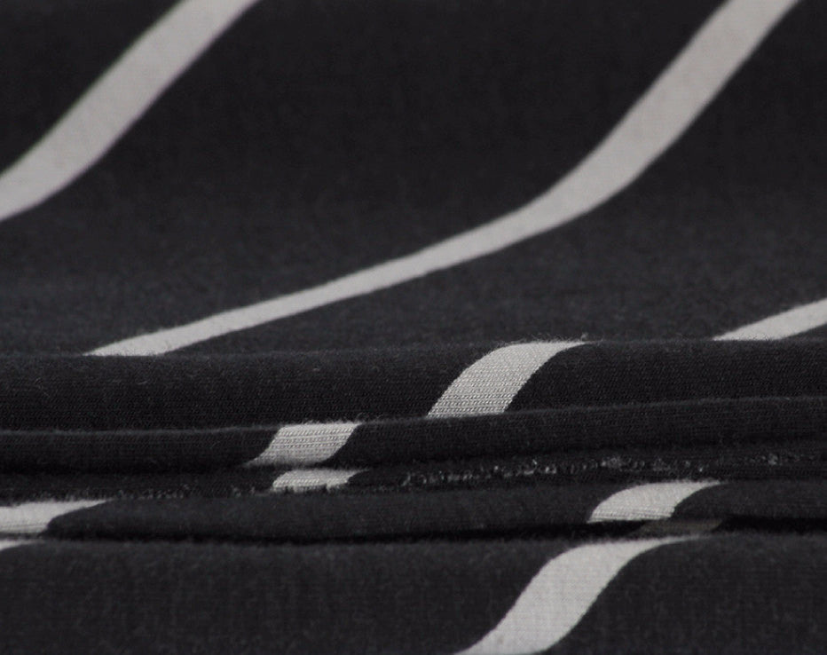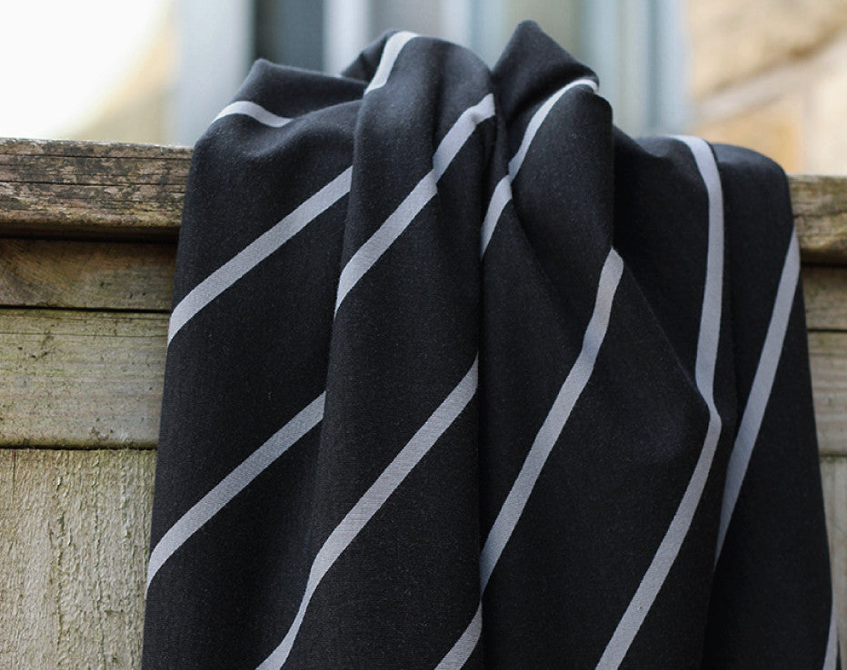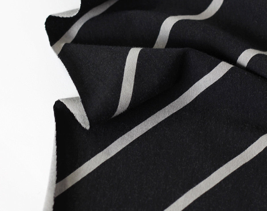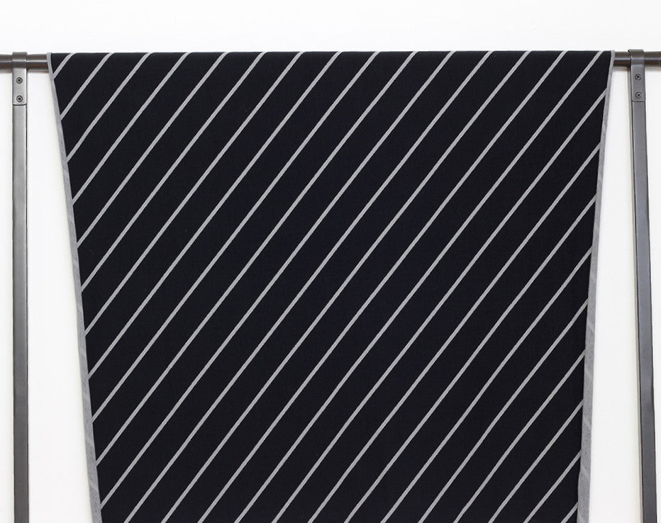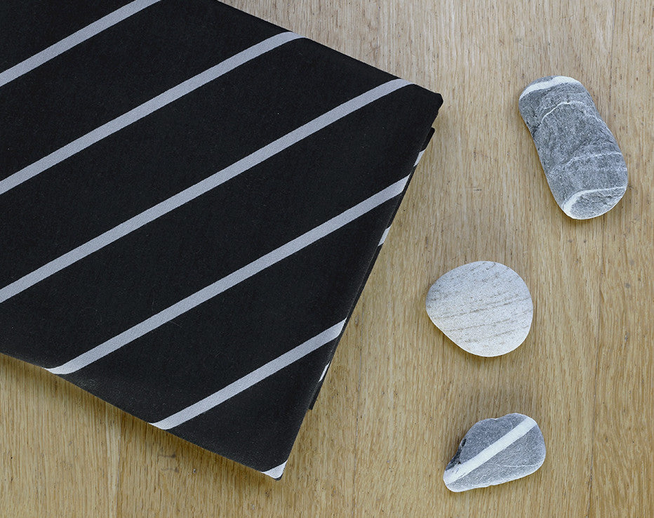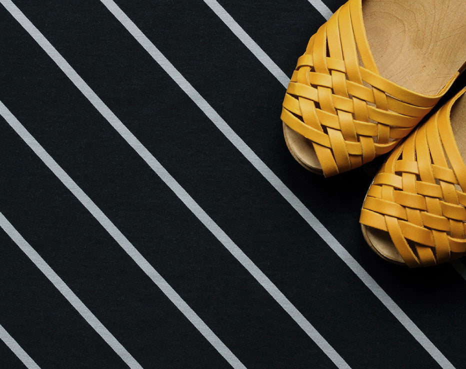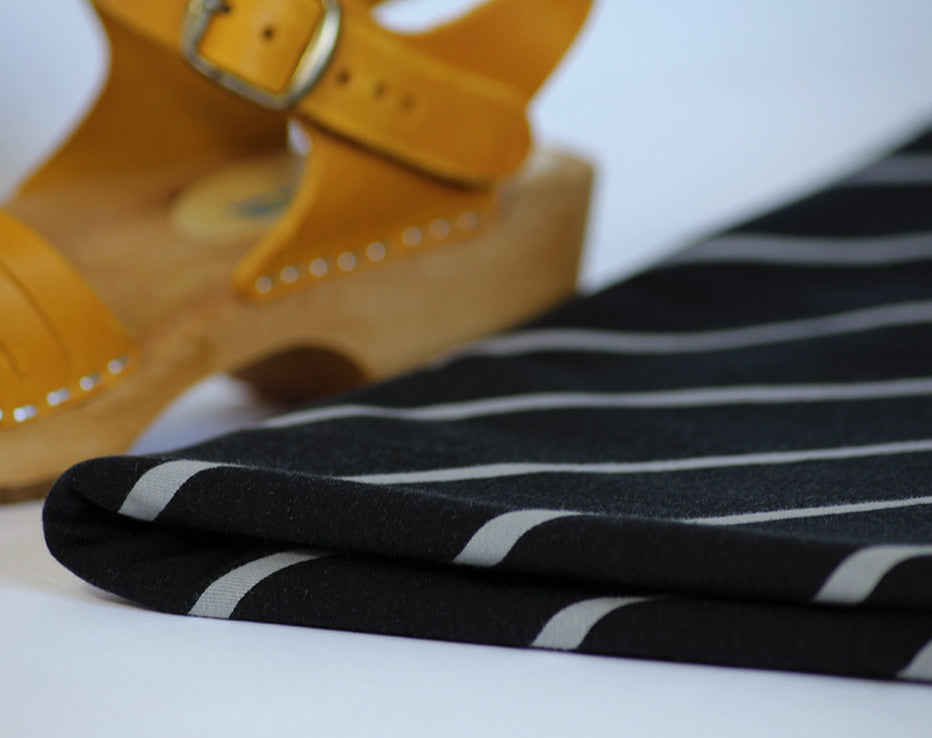 Just add mustard! That’s my recommendation for this luxurious organic jersey from Finland. What you see is what you get, cool, classic ‘Scandi’ contemporary style. Everyone loves stripes but diagonal stripes are just even better for me. This mid weight stretchy fabric is not just great for t-shirts, it would make fantastic sweatshirts or hoodies plus I’m still dreaming about my pencil skirt. I’m really loving our fabrics that are coming from Finland, they’re good strong jerseys, none of that wimpy stuff here! This jersey really is of exceptional quality. It will maintain its stretch, so your garment will last longer, which makes all the time and effort you put in all the more worthwhile.