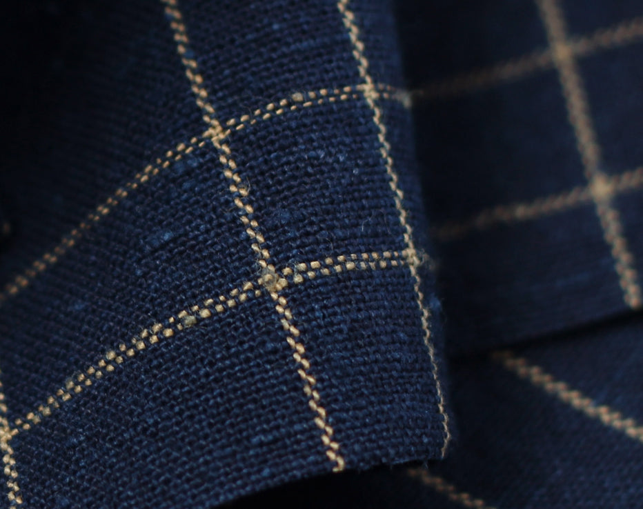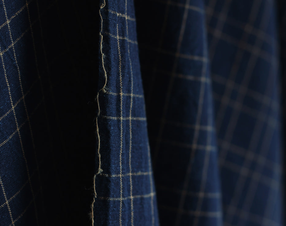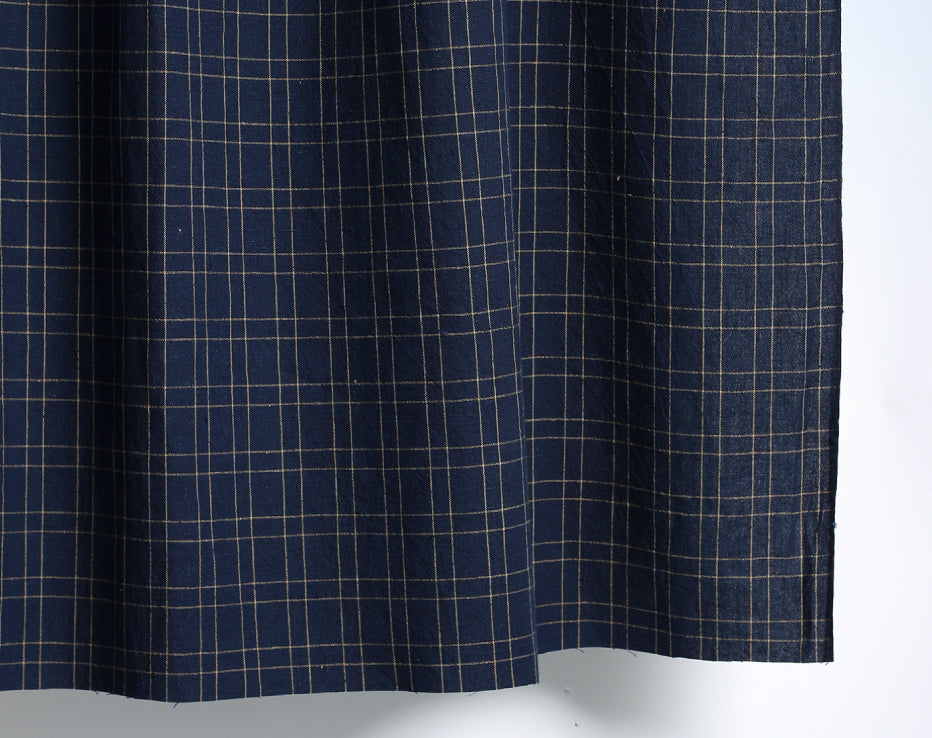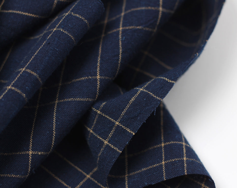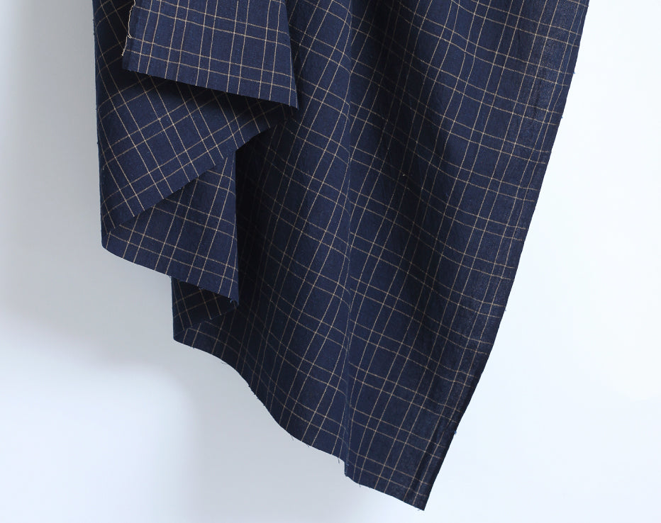 Madoka brings a whole new style to plaid and check! The grid design is created using persimmon dyed threads, made by the factory's own persimmon tanning dyer. The threads are forked through during the weaving process forming this wonderful lattice grid design. I am obsessing over the way the threads are finished and tied on one side of the selvedge, such beautiful little details displaying the time and labour involved. This fabric is a solid medium weight cotton with a unique texture because of the nepping technique used. With a crisp element to it but soft and not stiff, great for structured designs such as a lightweight jacket or wide-leg trousers. A dress would also be nice, plus this would work well for bags or home wear items.