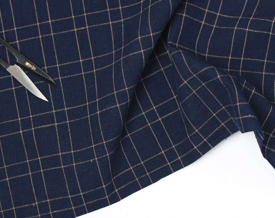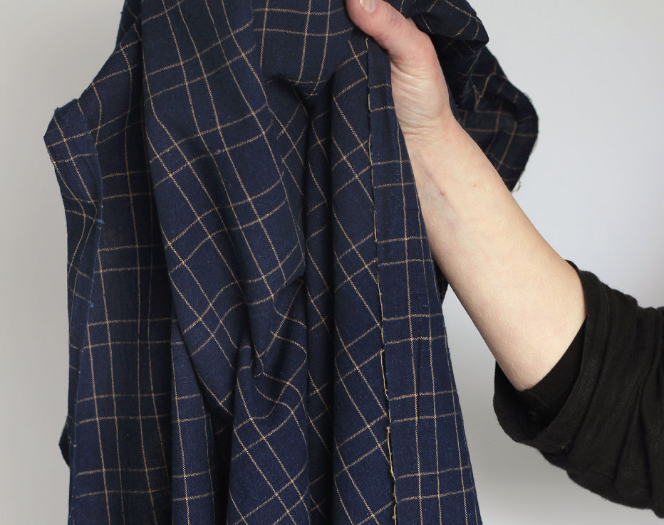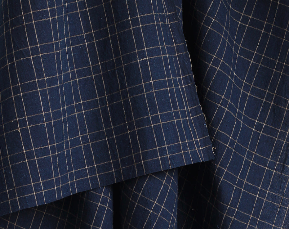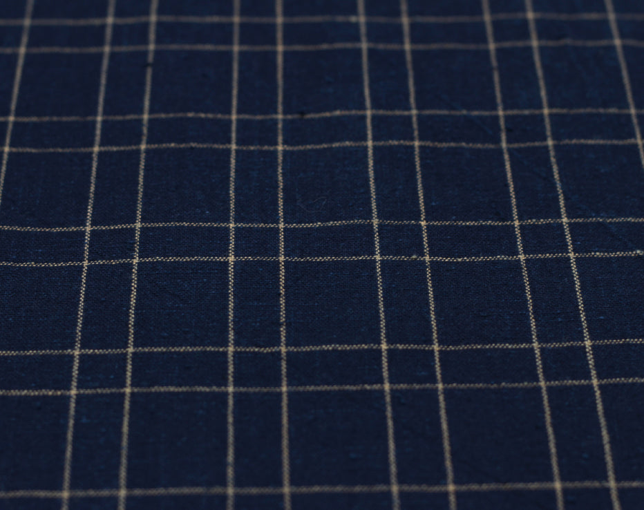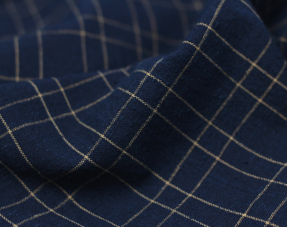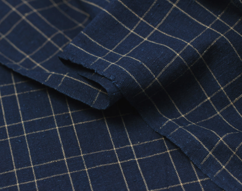 Madoka brings a whole new style to plaid and check! The grid design is created using persimmon dyed threads, made by the factory's own persimmon tanning dyer. The threads are forked through during the weaving process forming this wonderful lattice grid design. I am obsessing over the way the threads are finished and tied on one side of the selvedge, such beautiful little details displaying the time and labour involved. This fabric is a solid medium weight cotton with a unique texture because of the nepping technique used. With a crisp element to it but soft and not stiff, great for structured designs such as a lightweight jacket or wide-leg trousers. A dress would also be nice, plus this would work well for bags or home wear items.