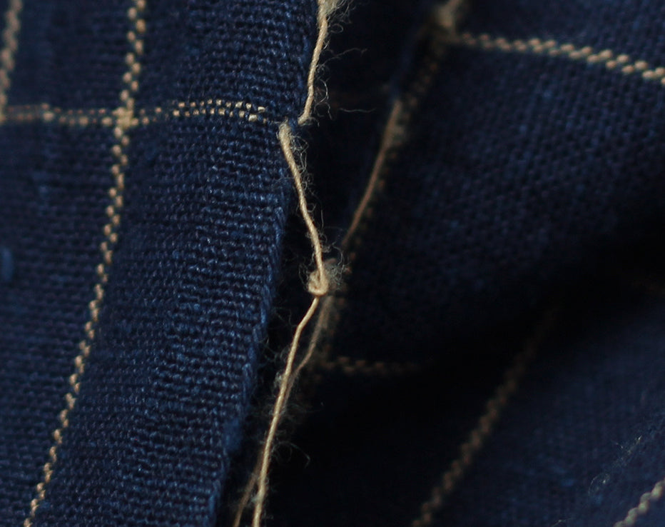 Kasuri means fibres dyed specifically to create patterns in Japanese. This exclusive Kasuri is produced on old-fashioned 1950s shuttle loom weaving machines, where they 'weave cloth slowly' and I bet it sounds amazing! While the vintage machines are running, the persimmon juice dyed threads are 'dropped in' by hand. It's similar to an Ikat technique, where the warp and weft threads interlace forming patterns within the fabric. During the weaving process, the cloth's nep also has an irregularity which is intentional, for that non-uniform look. You get the precision of well-built engineering combined with the unparalleled skill of the operator - who creates beauty like an artist playing an instrument.