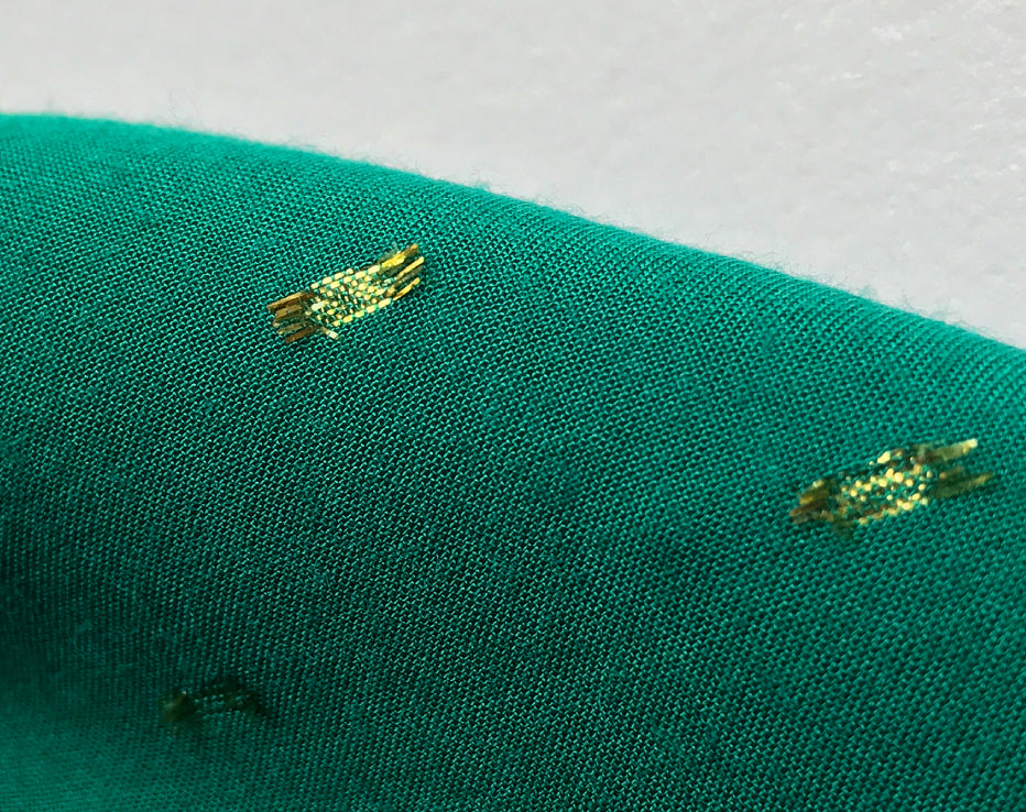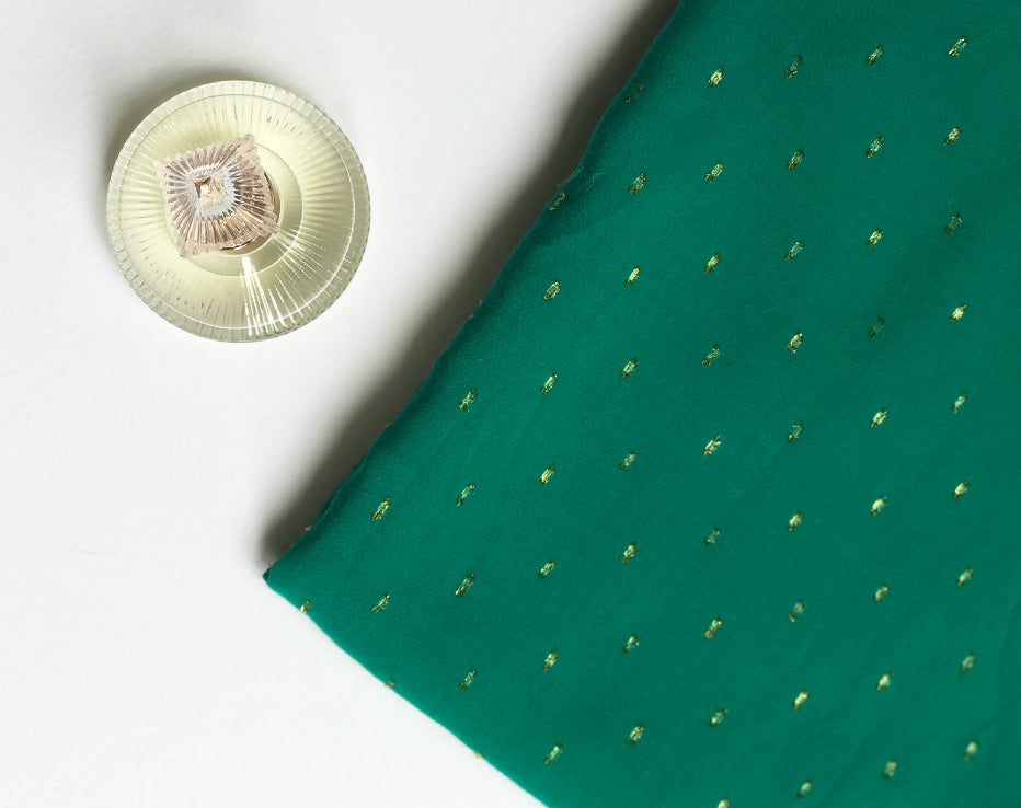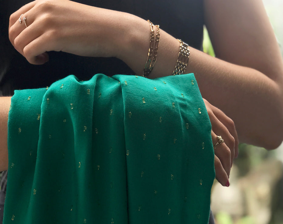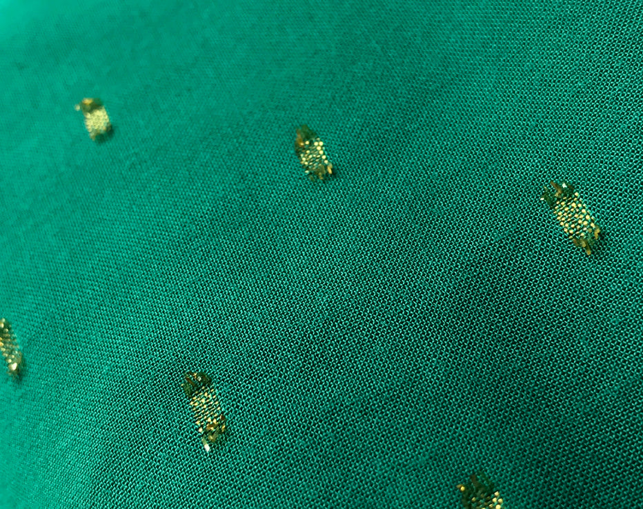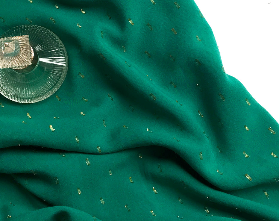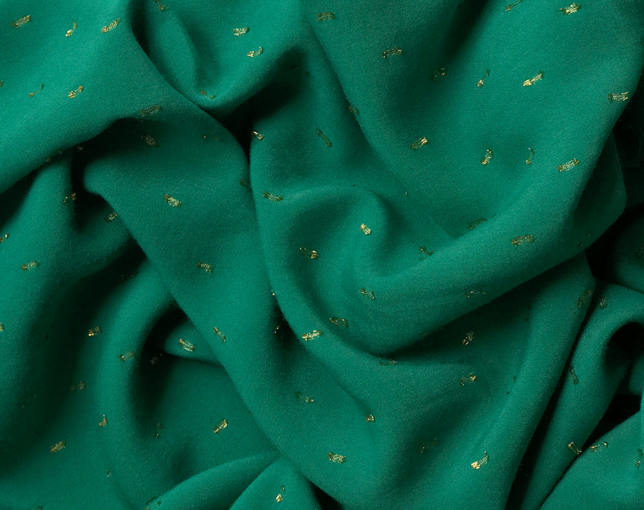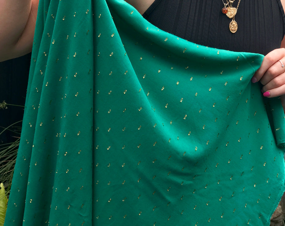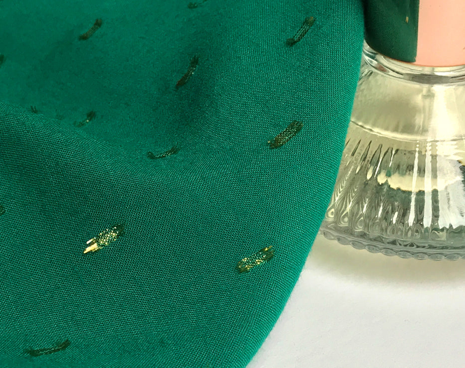 Where to start describing fabric this lush? This Paris brand first caught my attention when I started Faberwood and I can't believe it's taken me until now to stock some of their beautifully designed fabrics. A gorgeous emerald green viscose that provides a perfect base for the little metallic gold stitched motifs embroidered through out. I love the way it glistens, it's delicate and I think it's quite French!
