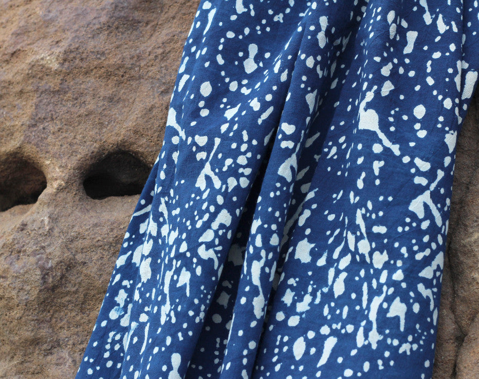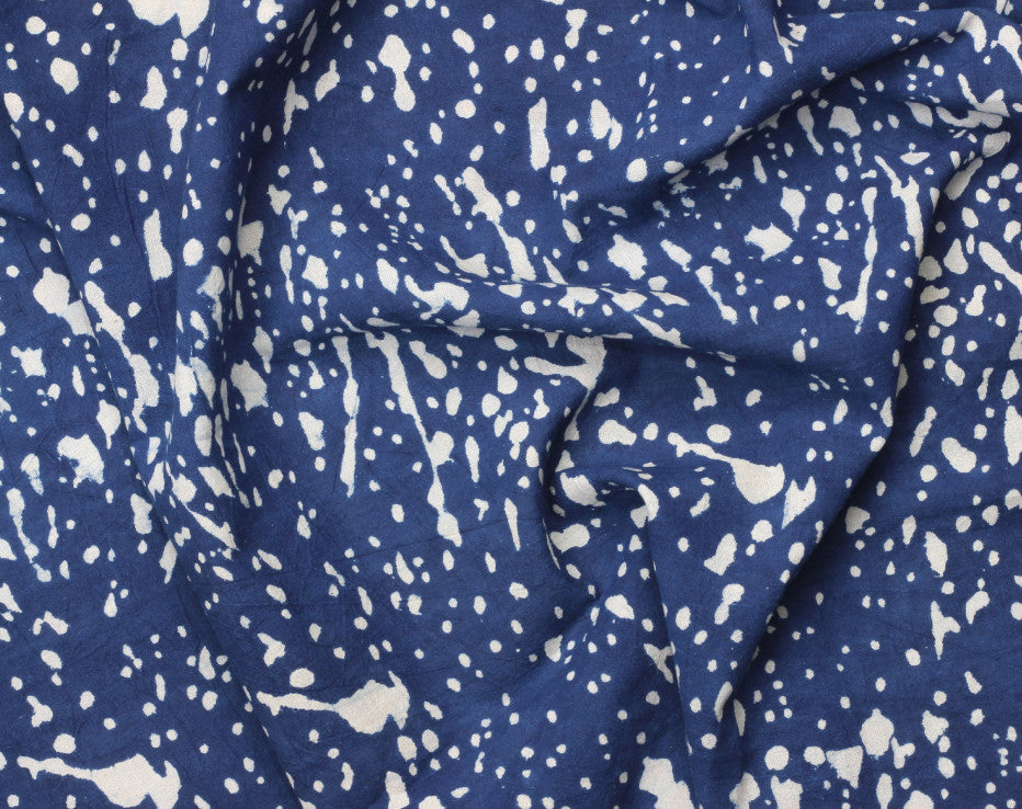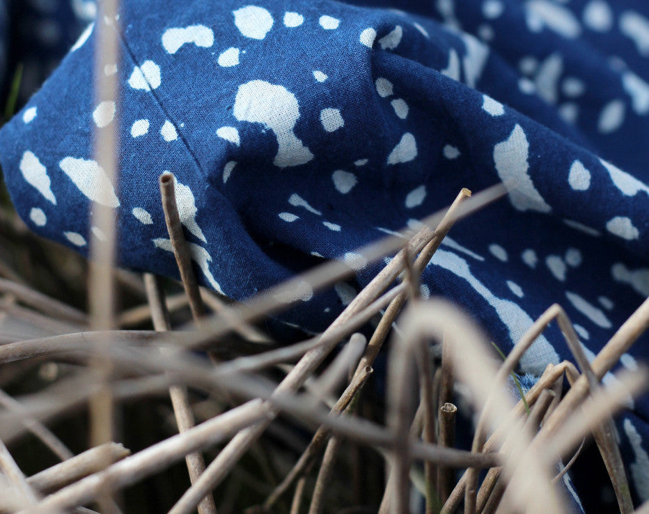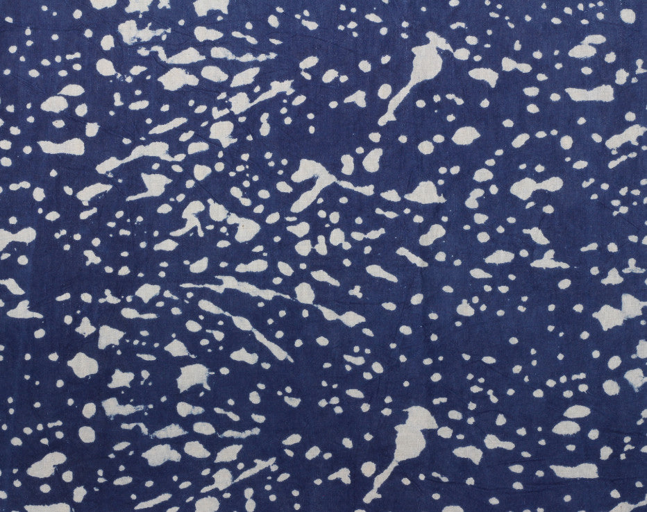 So I have to contain myself with this one! Is it splashes, splatters or spots? Amazing colour of indigo blue in this unique hand block and hand dyed fabric from India. This unique pattern is pretty abstract, not sure what else to say, other than it's awesome and it also gets a thumbs up from my 14 year old daughter! A medium weight cotton with a fab raw feel, totally natural. Due to the traditional dyeing technique it is advisable to cold wash it first before using to set the dyes. You could make something very special here, to be honest I don't think these designs are going to come around very often!