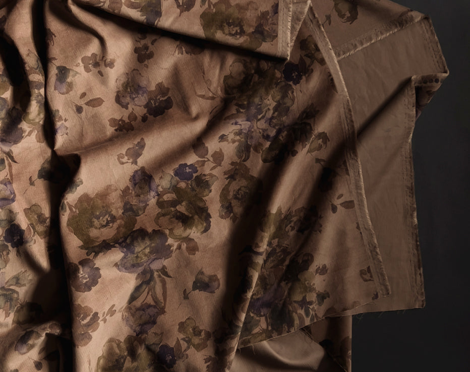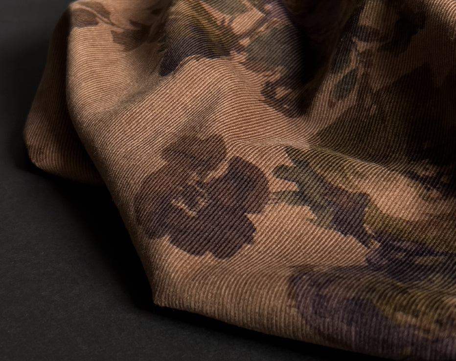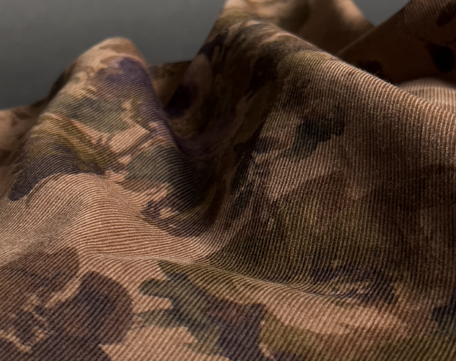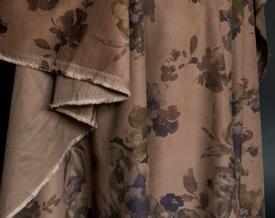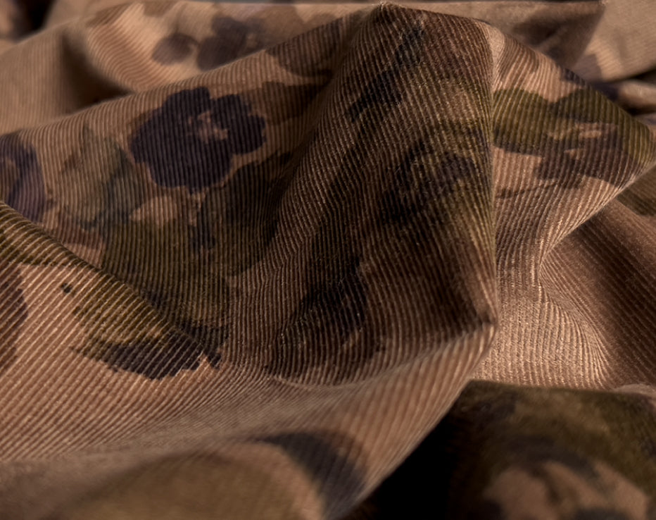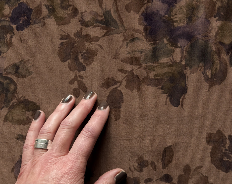 A stunning printed fine needle corduroy from Japanese brand Hokkoh, who make the most elegant fabrics featuring some stunning designs. This watercolour style print of roses on a subtle brown was challenging to photograph and portray its true shade, but we're confident it's captured. I can best describe it as coffee tones with a rusty hue, with the purples and olive-tinged greens, it's quite special. It feels super soft with a directional pile, you will keep stroking it, it is like delicate velvet. This is a rare find and not something you would regularly come across.