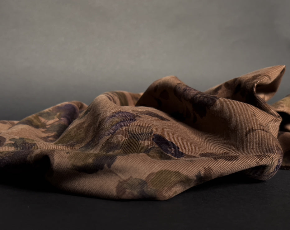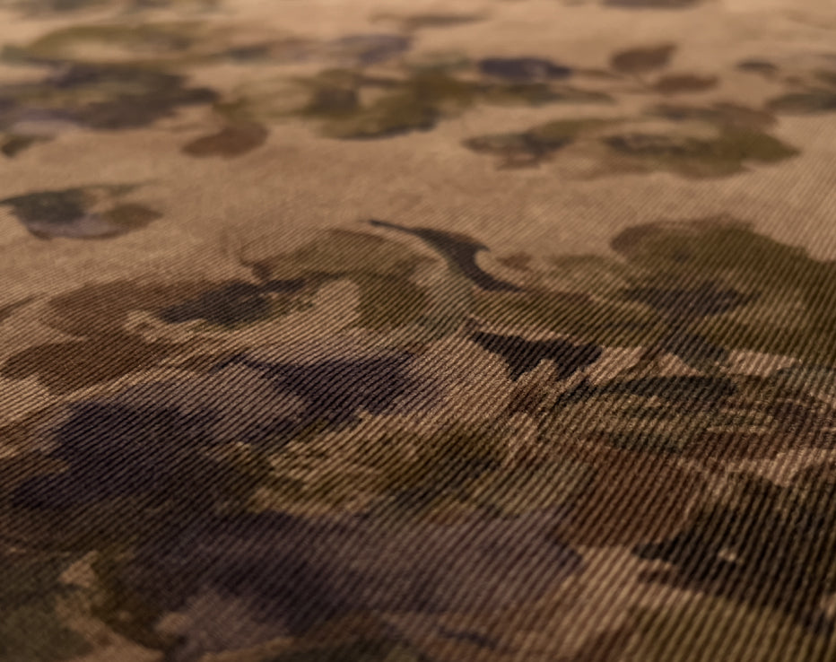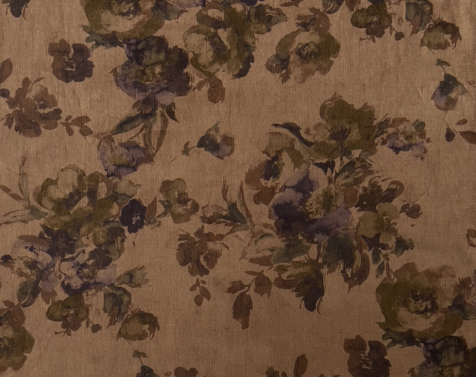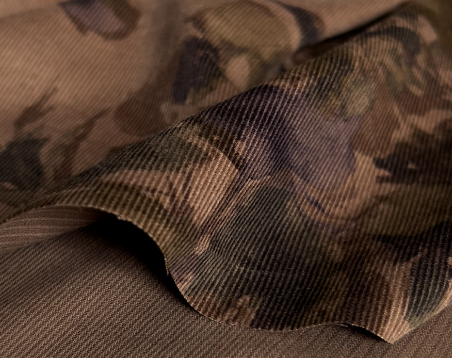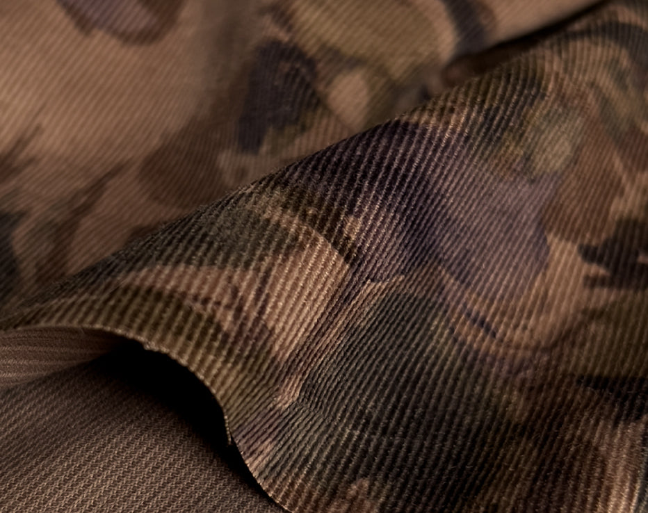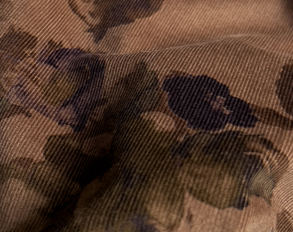 A stunning printed fine needle corduroy from Japanese brand Hokkoh, who make the most elegant fabrics featuring some stunning designs. This watercolour style print of roses on a subtle brown was challenging to photograph and portray its true shade, but we're confident it's captured. I can best describe it as coffee tones with a rusty hue, with the purples and olive-tinged greens, it's quite special. It feels super soft with a directional pile, you will keep stroking it, it is like delicate velvet. This is a rare find and not something you would regularly come across.
