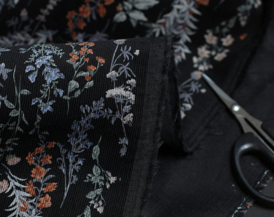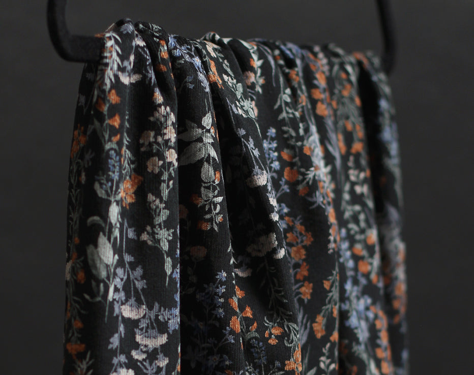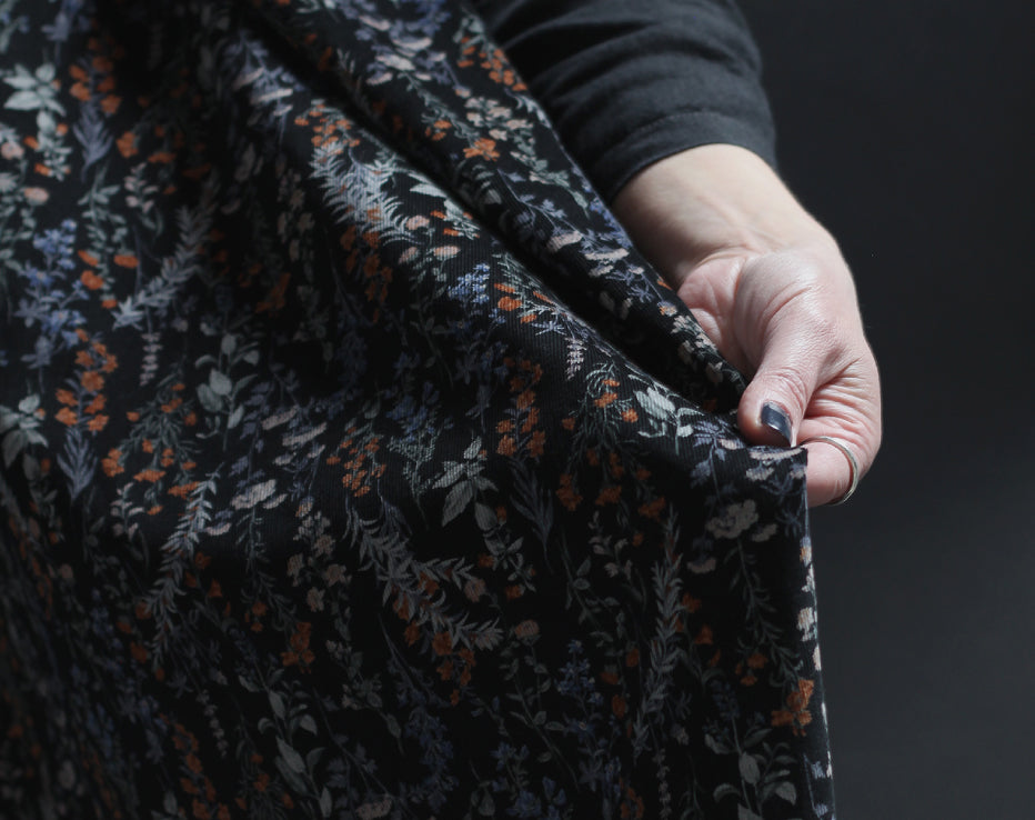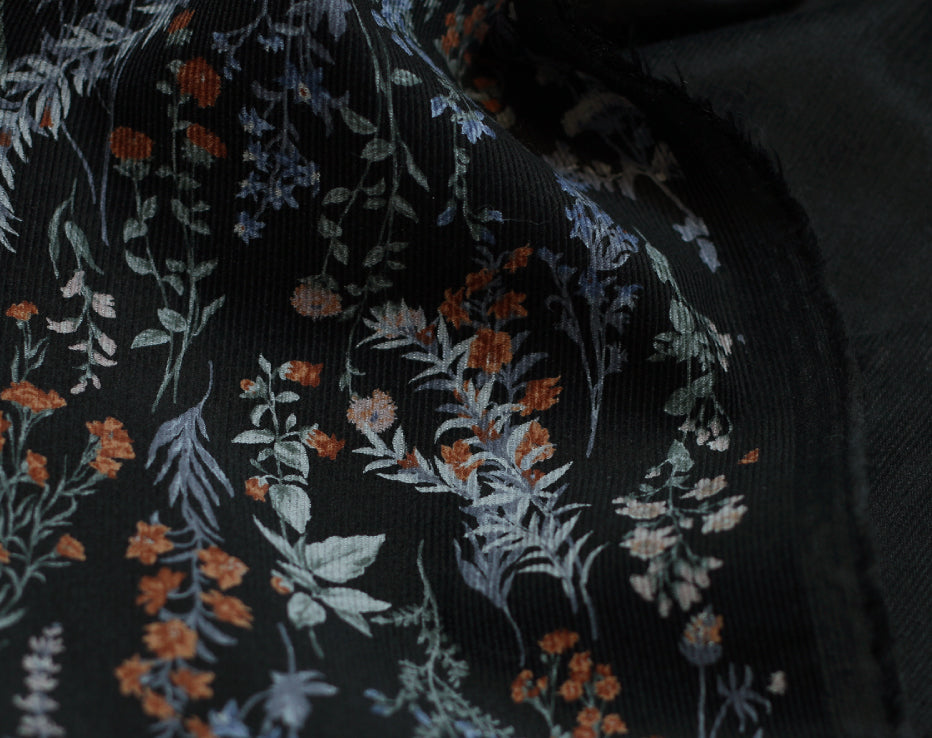 A beautiful, high-quality, printed corduroy from Japanese brand Hokkoh. We love moody florals in this style - the stunning cascading floral design works so well on the black base of fine wale, medium-weight crisp cord.