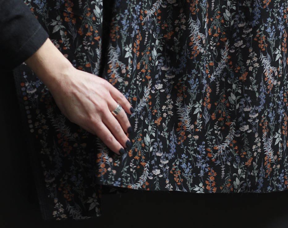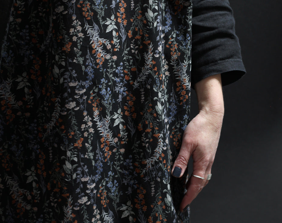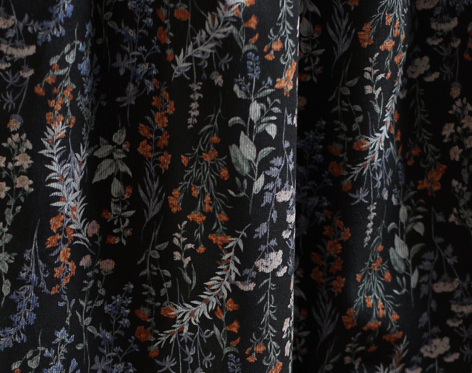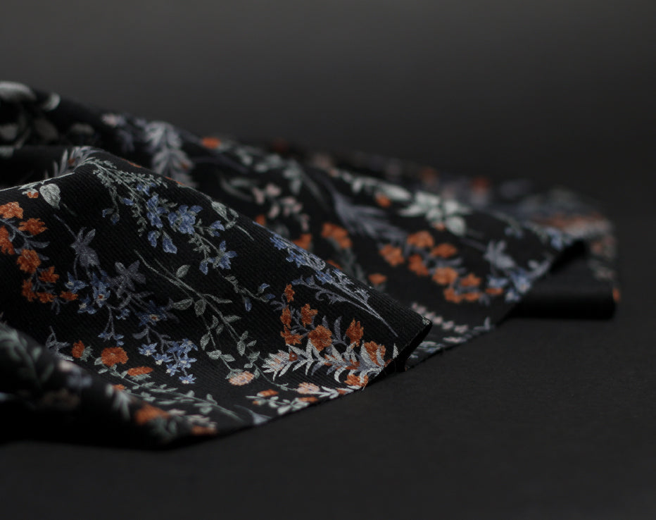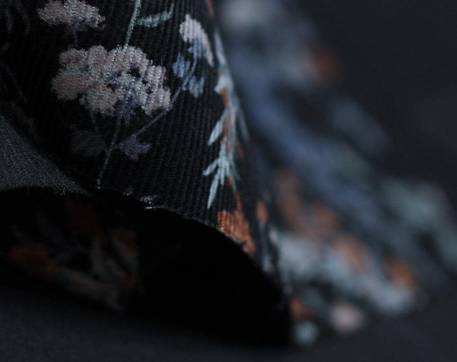 A beautiful, high-quality, printed corduroy from Japanese brand Hokkoh. We love moody florals in this style - the stunning cascading floral design works so well on the black base of fine wale, medium-weight crisp cord.