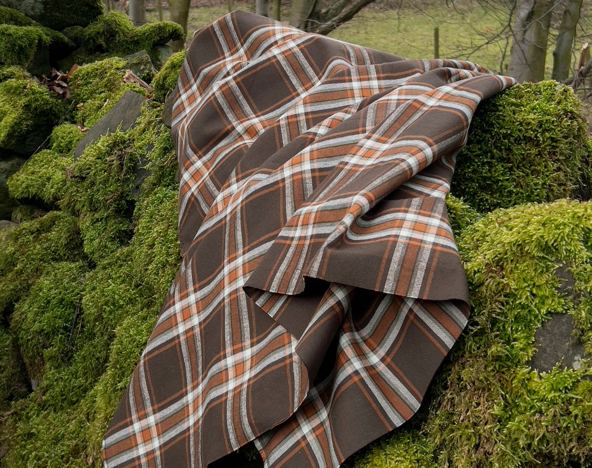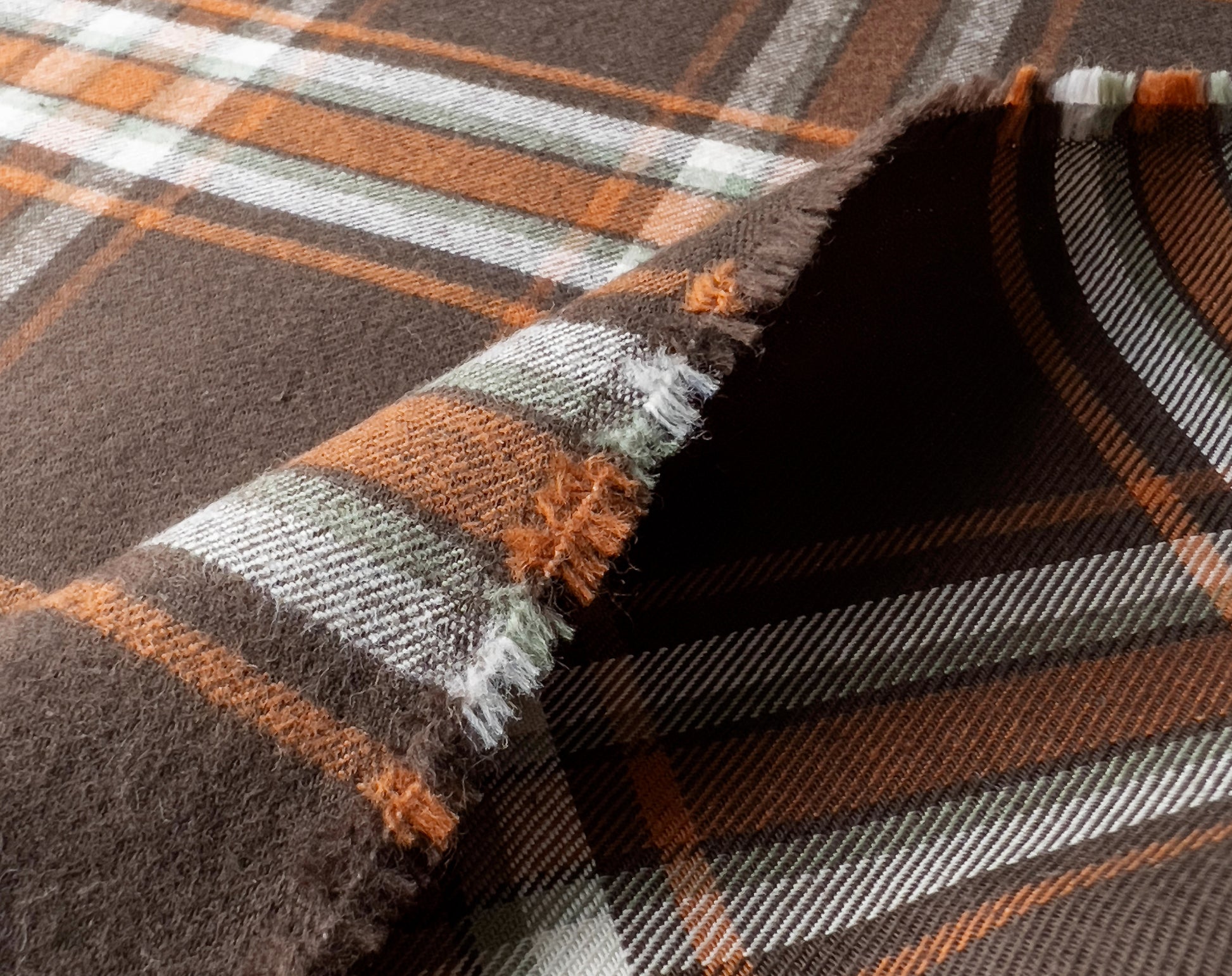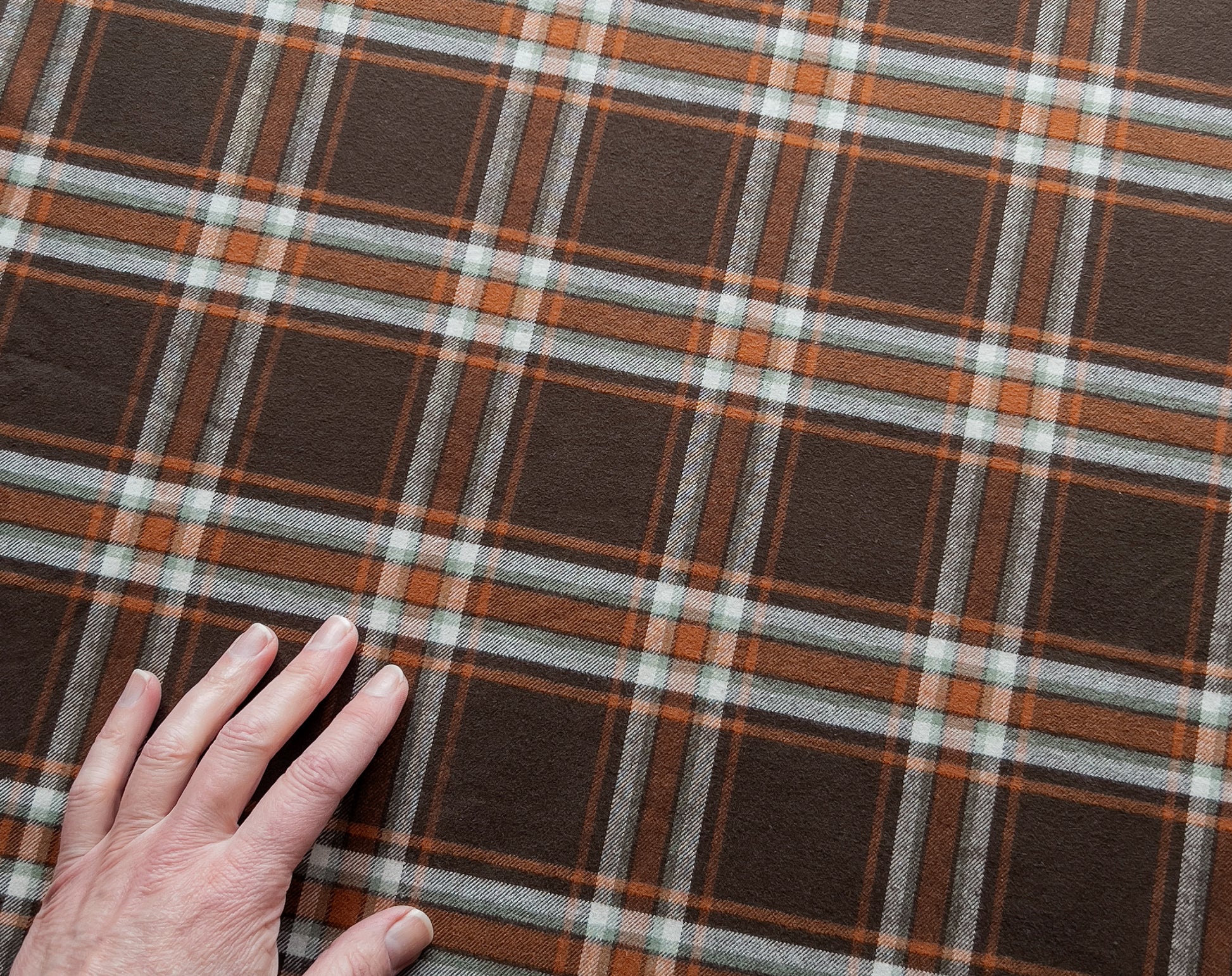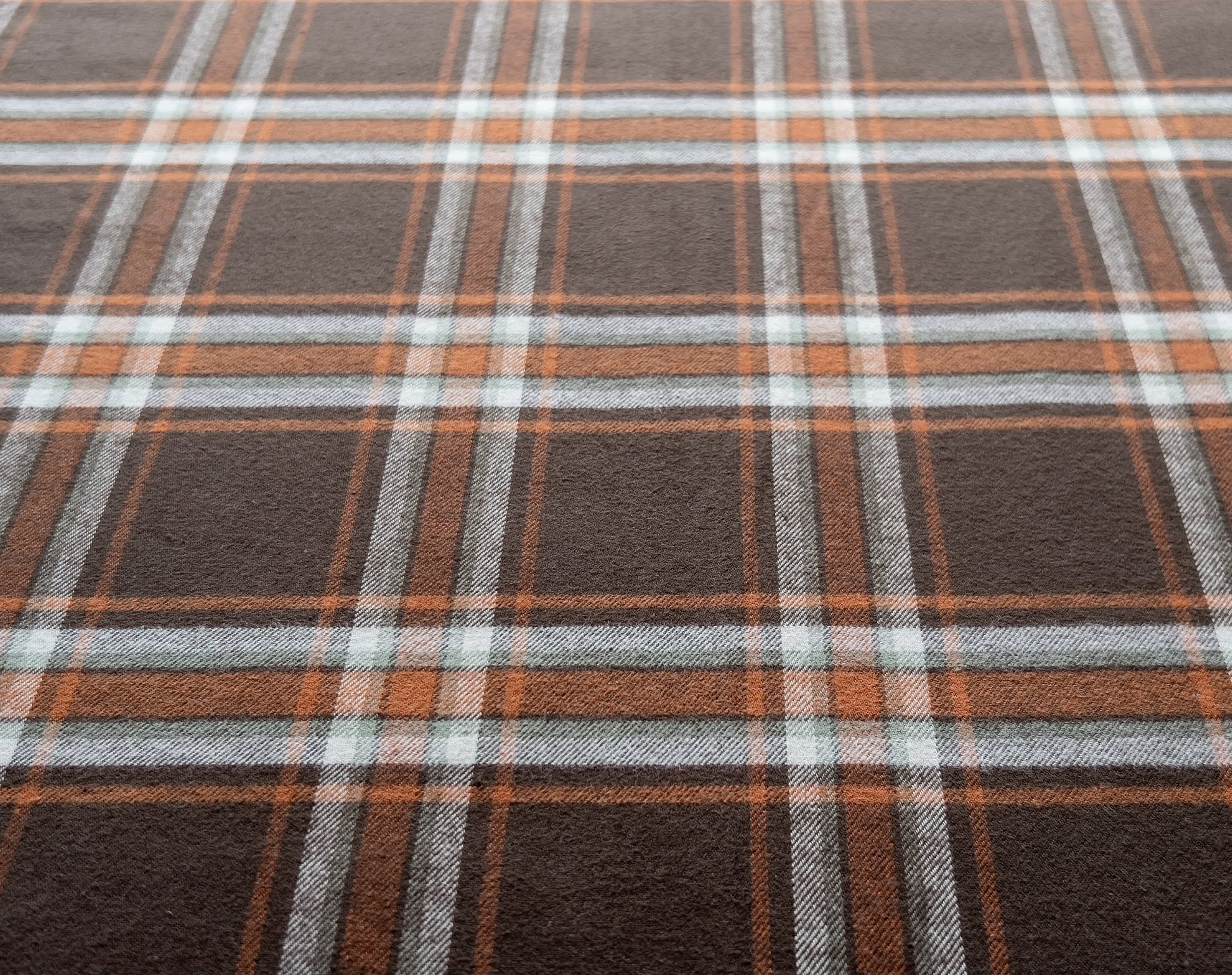 We are always on the lookout for great flannel, plaid is a firm favourite at Faberwood. We've stocked many of the American Mammoth flannels over the years, but this is an exquisite Japanese lighter-weight flannel. Brushed on one side it has a cozy lived-in feel, ready to be made into tops, shirts, or our choice - a beautiful dress. The brown is a lush chocolate shade contrasting nicely with the rust orange check and just a hint of sage green. All lovely, mellow tones.