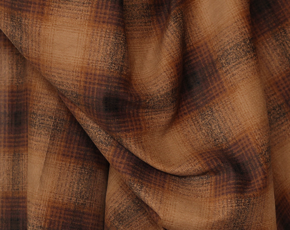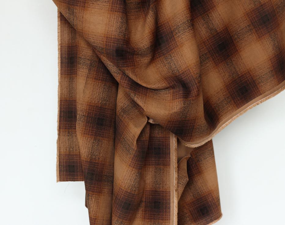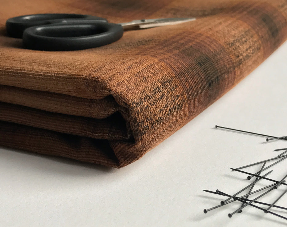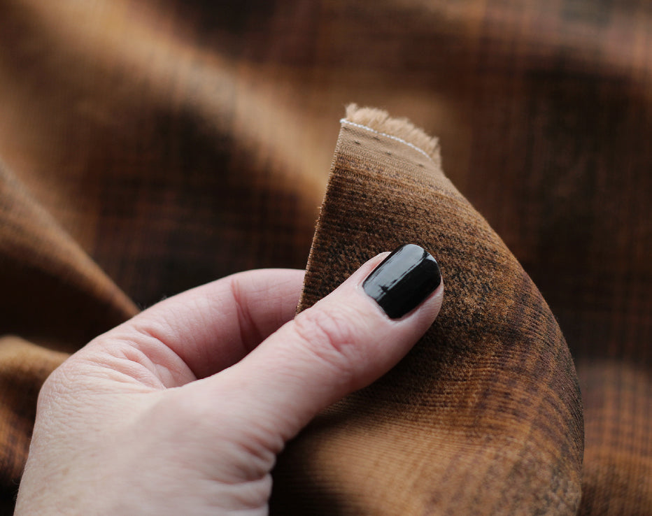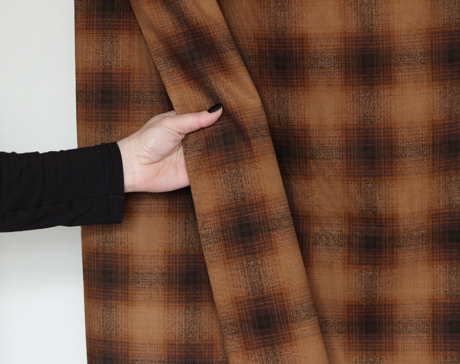 A really special and interesting cotton cord imported from Japan. Featuring a subtle plaid check design, perfect for Autumn sewing! Defined as baby 'wale' cord, it is so fine it feels quite delicate and soft. I think there's a touch of retro with these warming browns and the rust overtones, the natural light lifts out the beautiful hues. Every time I receive a Japanese fabric I'm in awe of the precision and textile design perfection.
