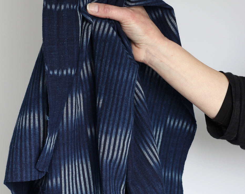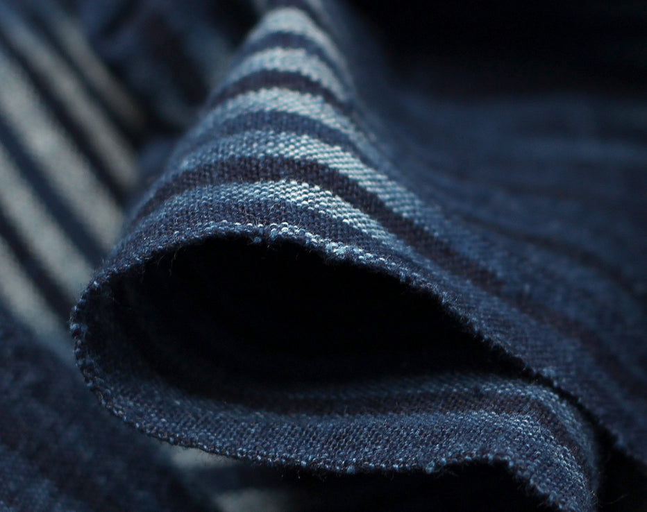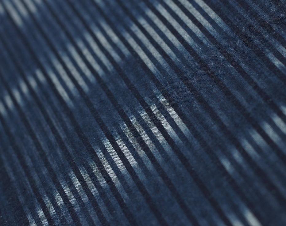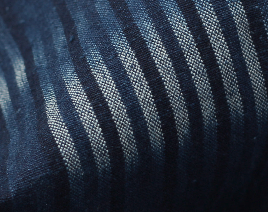 These fabrics are made in a similar way to selvedge denim with a distinctive quality feel like no other. Such fabrics are not mass-produced and will stand the test of time allowing the wearer to develop their own custom item. Completely made of cotton the dyes used are organic coming from natural indigo and persimmon juice. Kasuri will soften over time with wear and will develop a beautiful and natural fade just like Japanese denim.