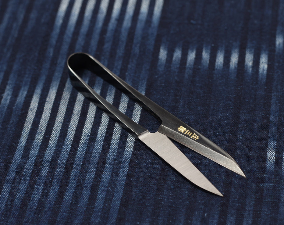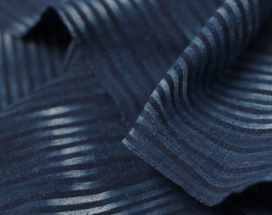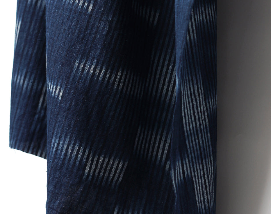 Kasuri means fibres dyed specifically to create patterns in Japanese. This exclusive Kasuri is produced on old-fashioned 1950s shuttle loom weaving machines, where they 'weave cloth slowly' and I bet it sounds amazing! While the vintage machines are running, the persimmon juice dyed threads are 'dropped in' by hand. It's similar to an Ikat technique, where the warp and weft threads interlace forming patterns within the fabric. During the weaving process, the cloth's nep also has an irregularity which is intentional, for that non-uniform look. You get the precision of well-built engineering combined with the unparalleled skill of the operator - who creates beauty like an artist playing an instrument.