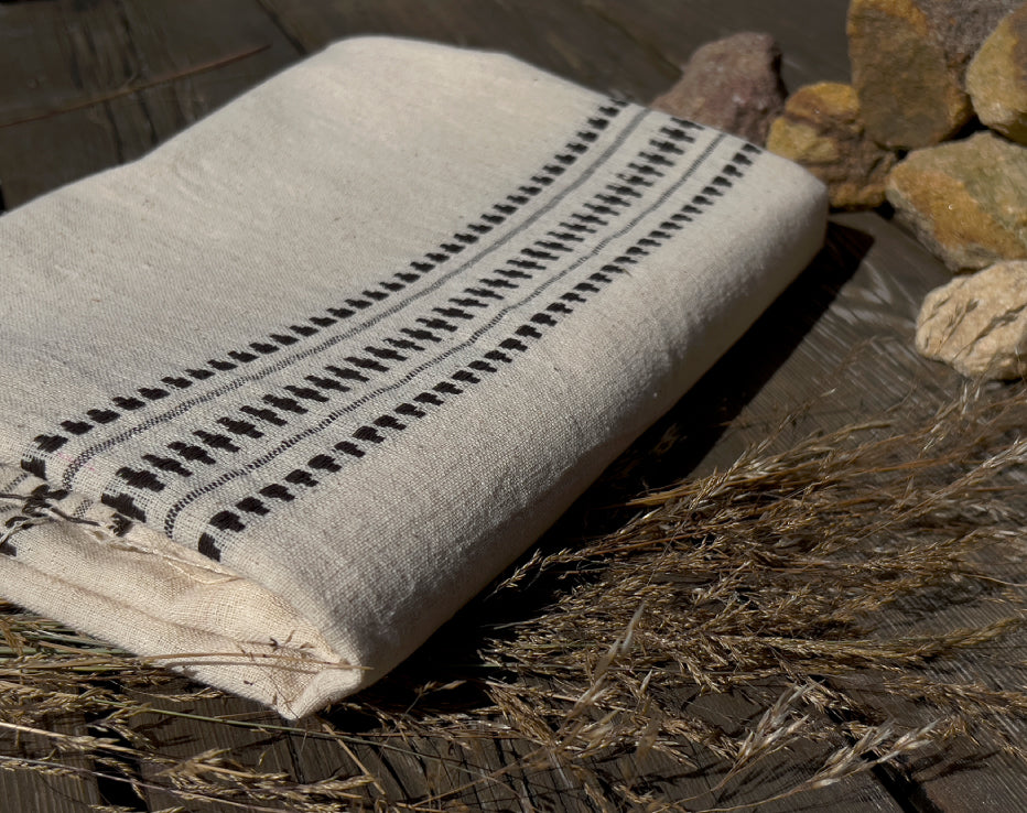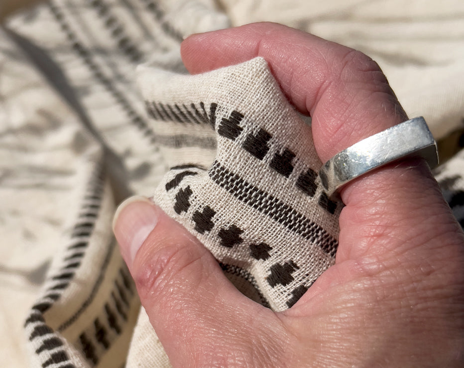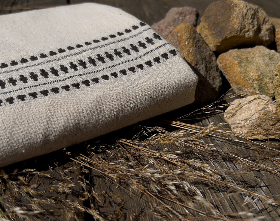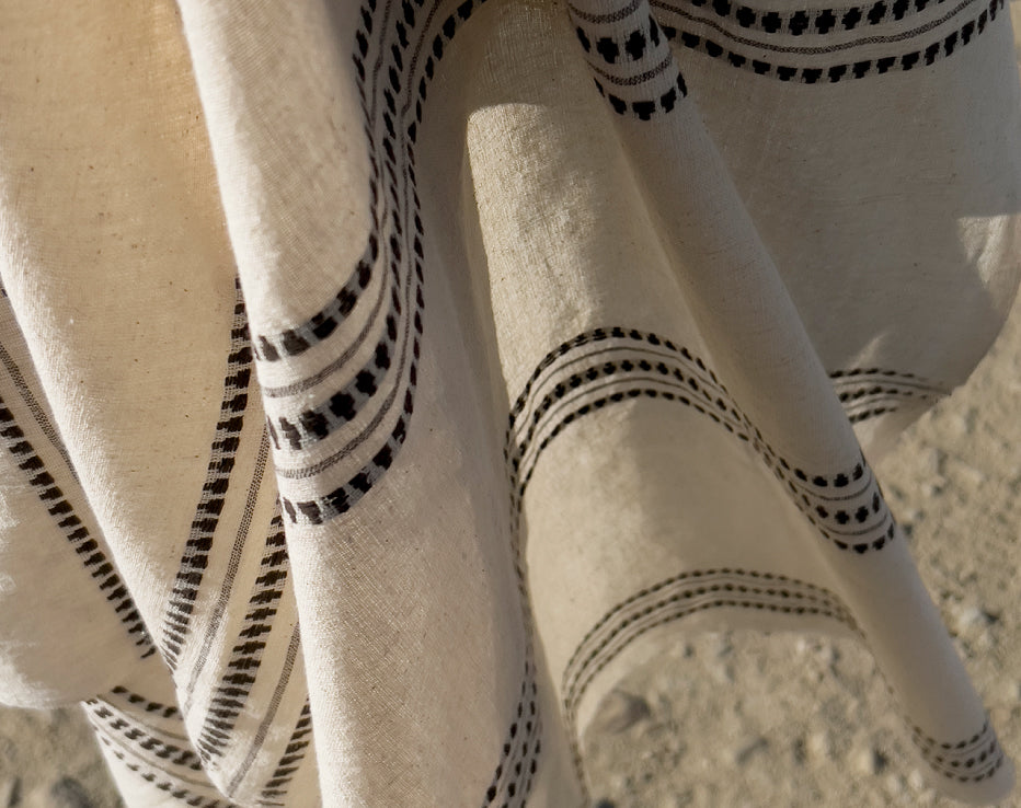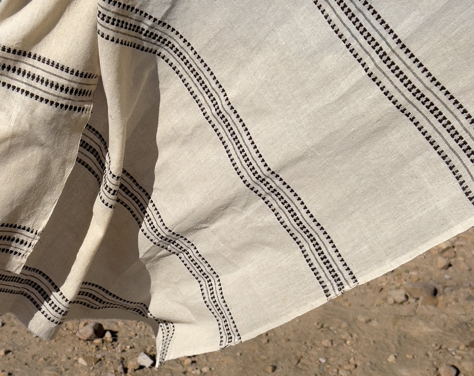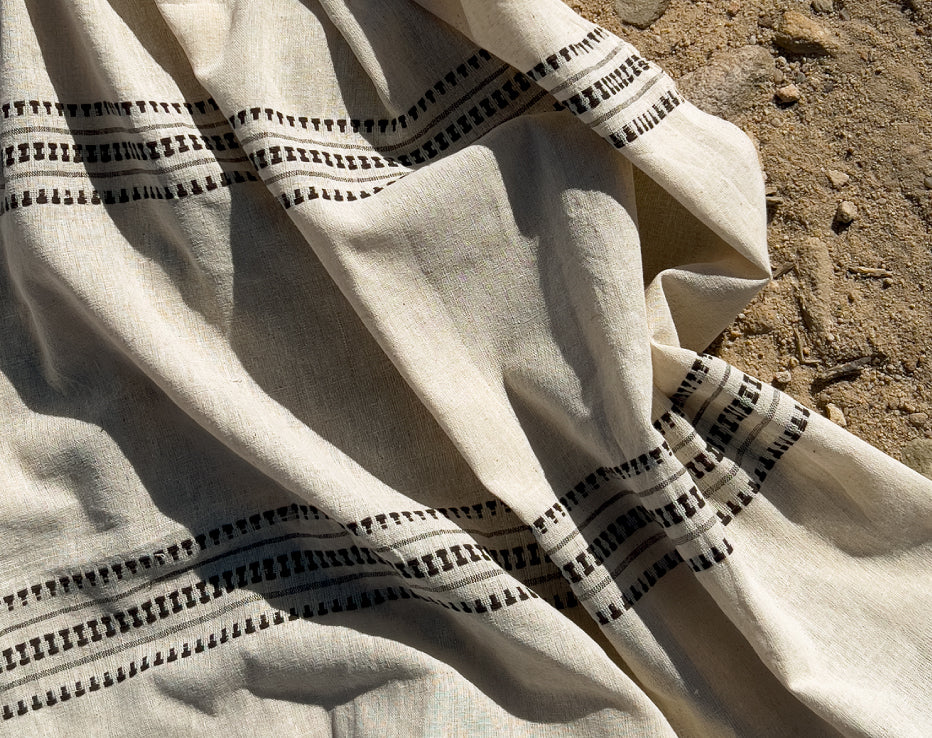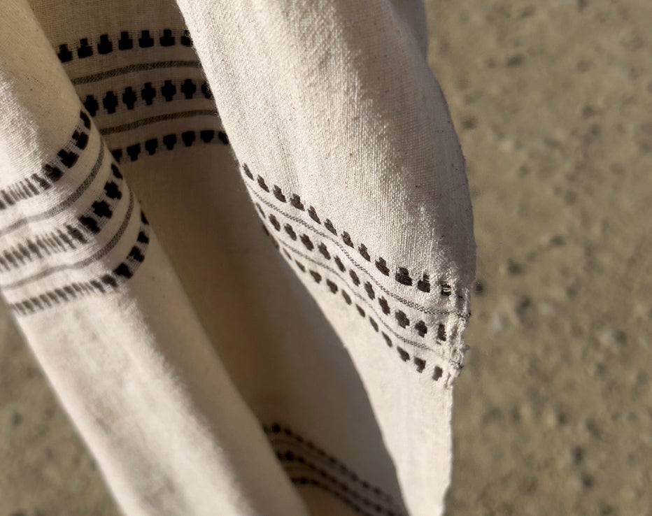 That something is this fabric. Made from handmade unbleached yarn, the stitched motifs are traditional tribal art, inspired by local and natural forms. We are so pleased to have had this made especially for us. I was able to discuss all the details with the maker, who then communicated with the weavers. Feeling lightweight and not see-through, the base shade reminds me of dried stone and desert sand and has a warm oatmeal tone.