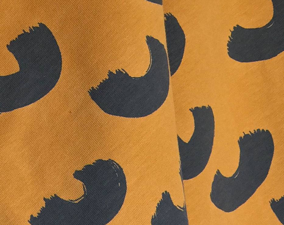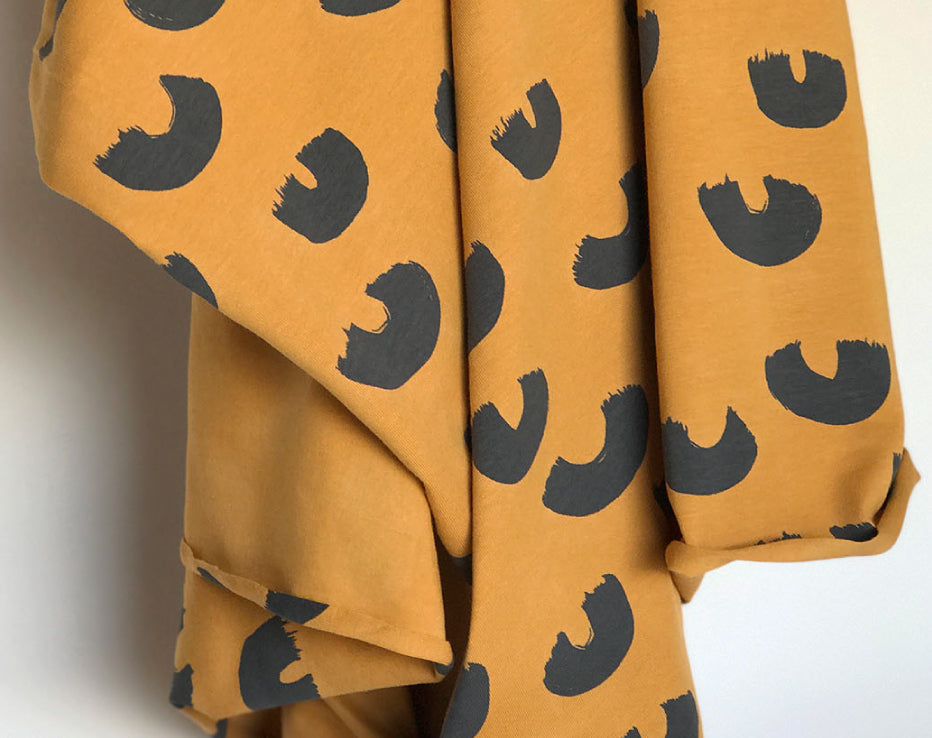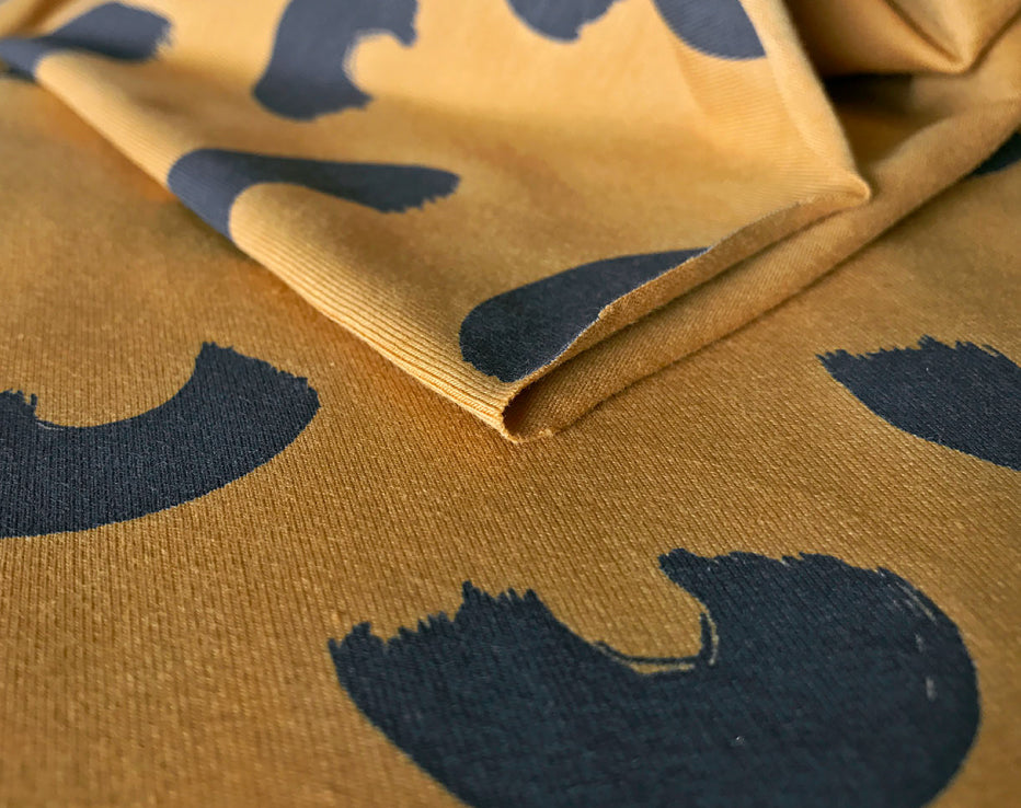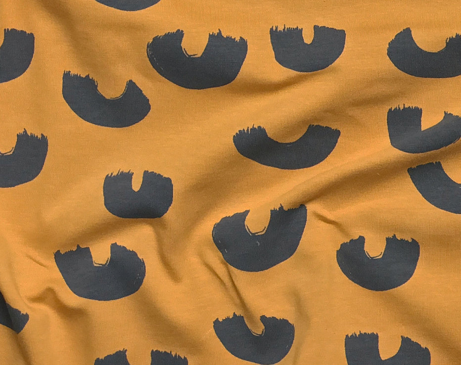 'Designed with love in Finland' is what they say at Papu Stories, the design and lifestyle brand from Finland. Artist's drawings and designs are the main feature of these fabulous stretch knits, they will make some very unique clothes. The quality of this grey dense print on a divine mustard tone gives you the illusion it could have just been painted on by hand. These fabrics have a good strong stretch due to the elastane in them, making them perfect for leggings, tees and hoodies. Who can resist a bit of fun with this!