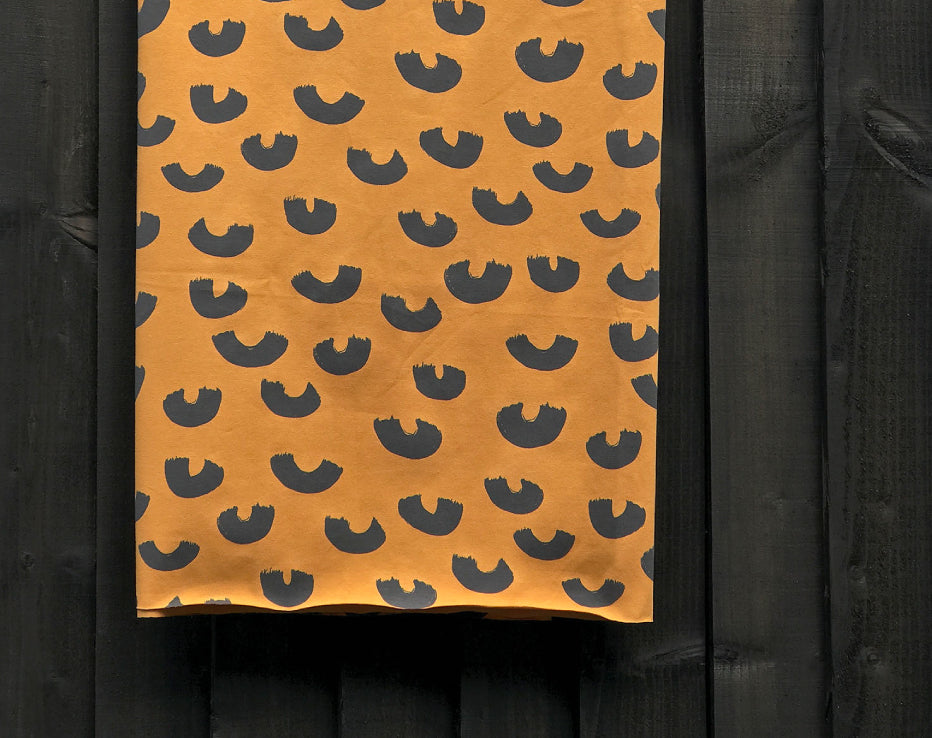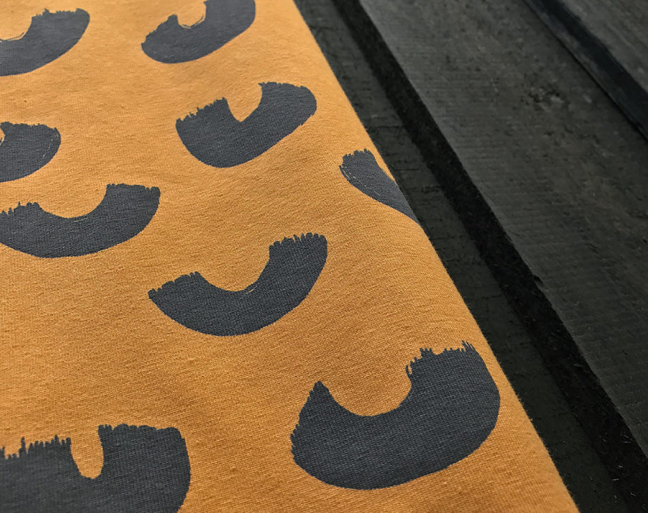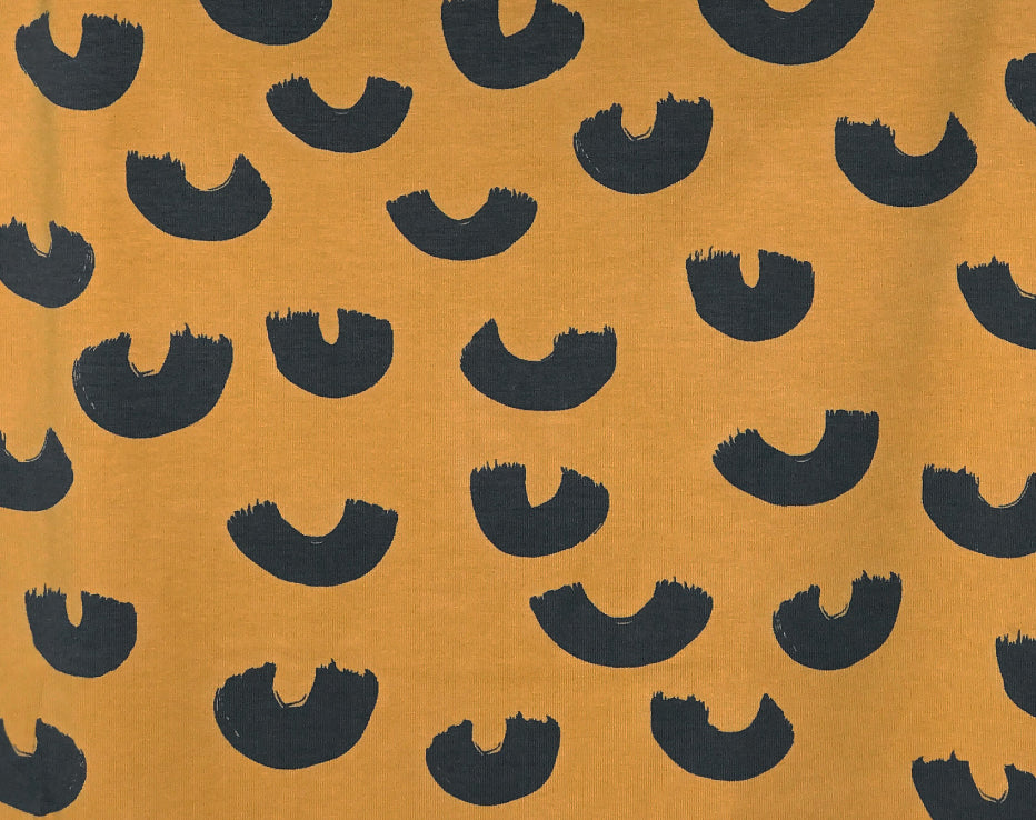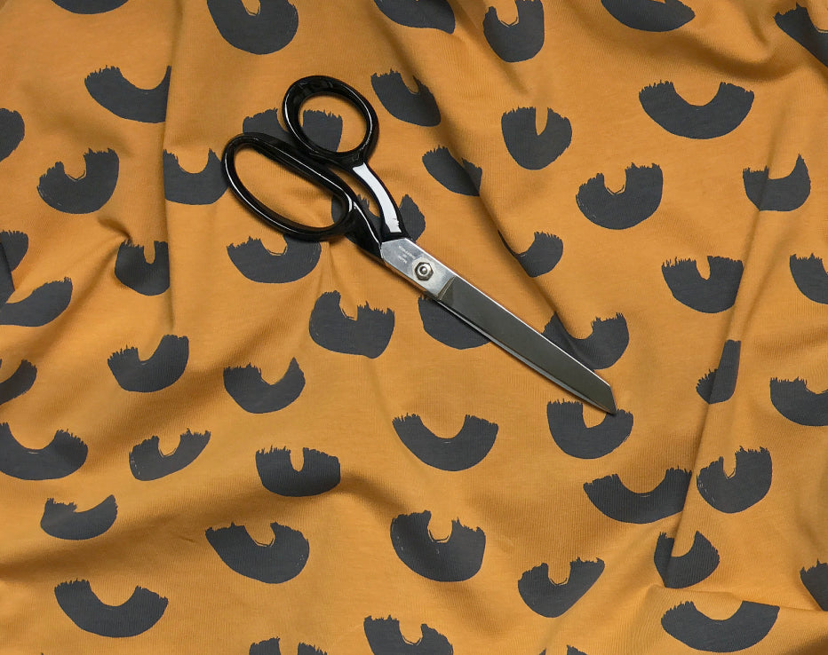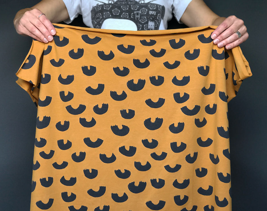 'Designed with love in Finland' is what they say at Papu Stories, the design and lifestyle brand from Finland. Artist's drawings and designs are the main feature of these fabulous stretch knits, they will make some very unique clothes. The quality of this grey dense print on a divine mustard tone gives you the illusion it could have just been painted on by hand. These fabrics have a good strong stretch due to the elastane in them, making them perfect for leggings, tees and hoodies. Who can resist a bit of fun with this!