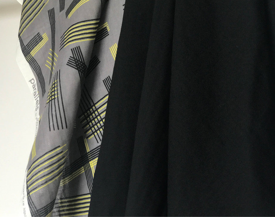 This design by Ellen Baker for Kokka is from the Parallels collection and what a blast from the 80s! Gorgeous retro design in a fab colour combination features in a double gauze cotton made in Japan. I love bringing this type of fun element to Faberwood but if this design is a bit much for you, I've included a black double gauze in the collection to give panelling options.