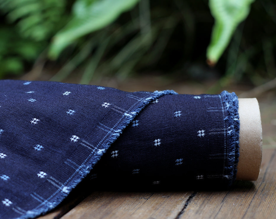 We have managed to acquire some beautiful fabrics from Thailand recently and I could not resist this luxurious 100% cotton that is double-faced. I find this so unusual I had just had to add it to our collection. This is two layers of indigo-dyed fabric stitched together and you can choose to use either side. Sourced from an expert denim supplier who has a close connection with textile mills in Japan and Thailand. I think this was originally produced for high-end shirt making. I love the geometric mini ikat design backed by an interesting woven check. These mills supply exclusive clothing brands that specialise in authentic styles, dedicated to timeless style.