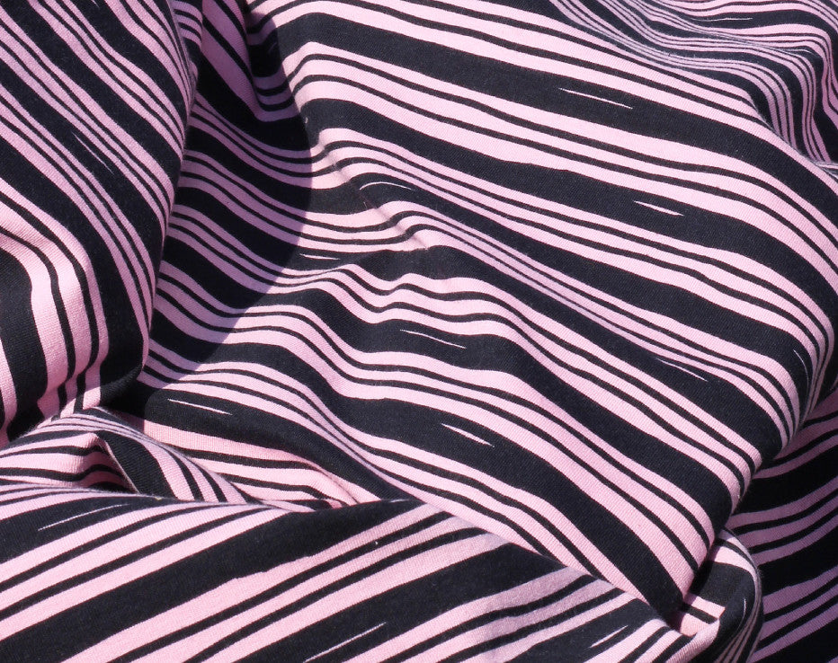 A beautiful Scandinavian fabric with a unique ‘wonky’ stripe pattern from Finnish brand PaaPii Design. These bold black lines look like they could have been drawn with a marker pen and after family discussions we’ve decided the light pink colour reminds us of Ski yoghurt! This organic stretch jersey is perfect for t-shirts and tops, but has enough weight for lots of different clothing items. It’s made in Europe and very good quality, you can tell the elastane in it will mean it keeps it's shape on wearing. I think this single knit fabric would be great paired with solid black. As with all stretch fabrics, pre-washing is recommended, to allow for a little shrinkage. I like this design for it’s modern geo style and it’s a super win that it comes in a wide width.