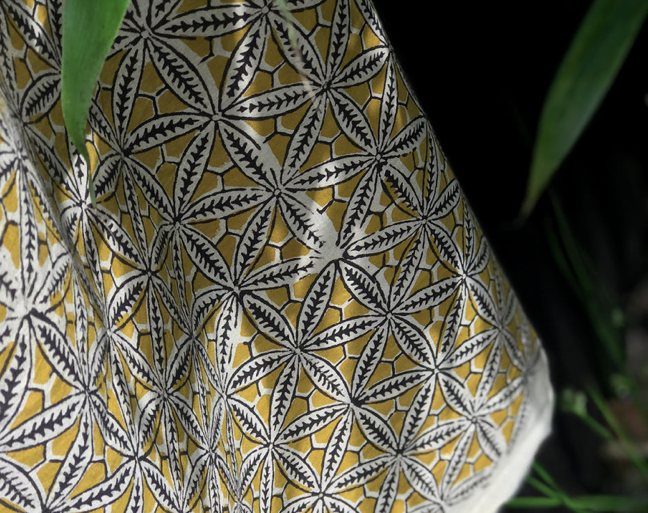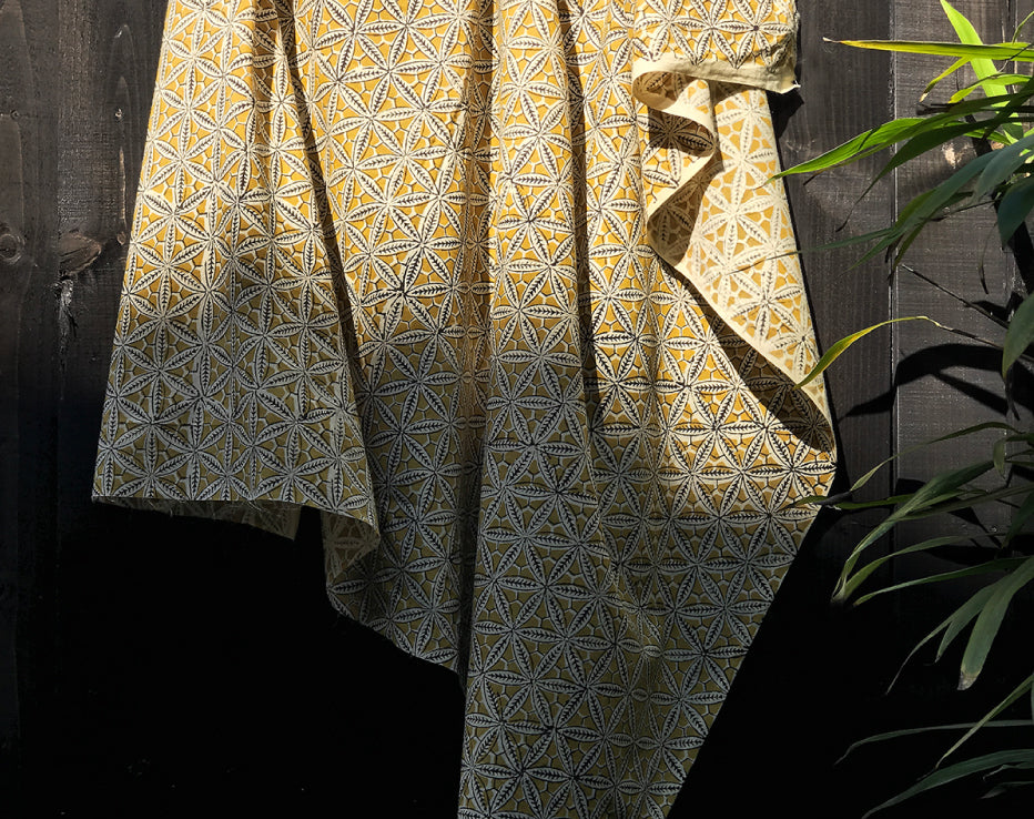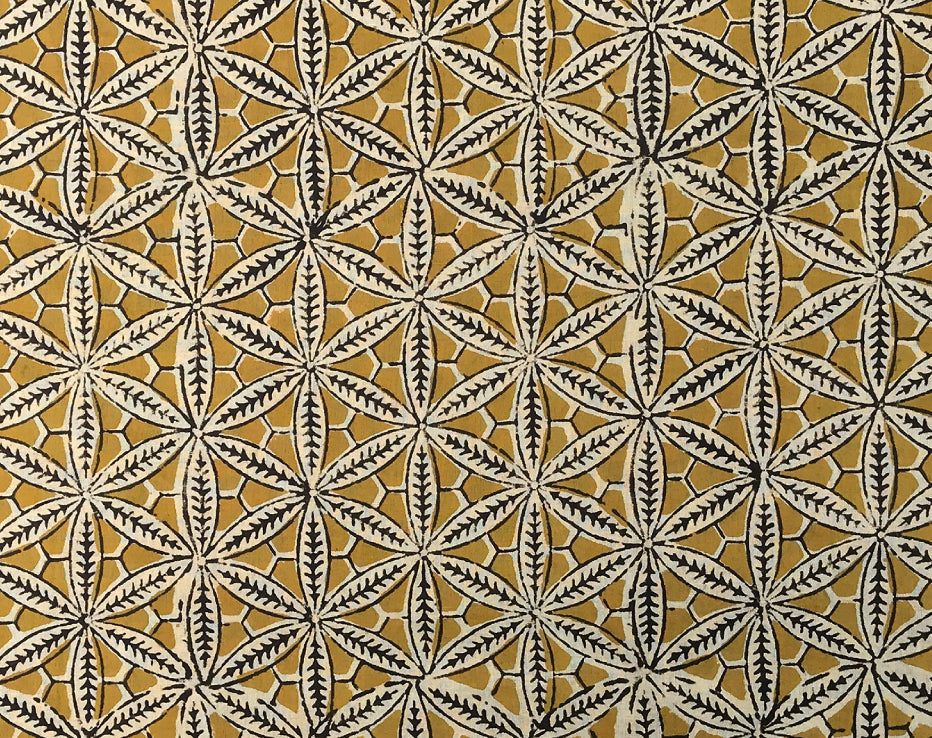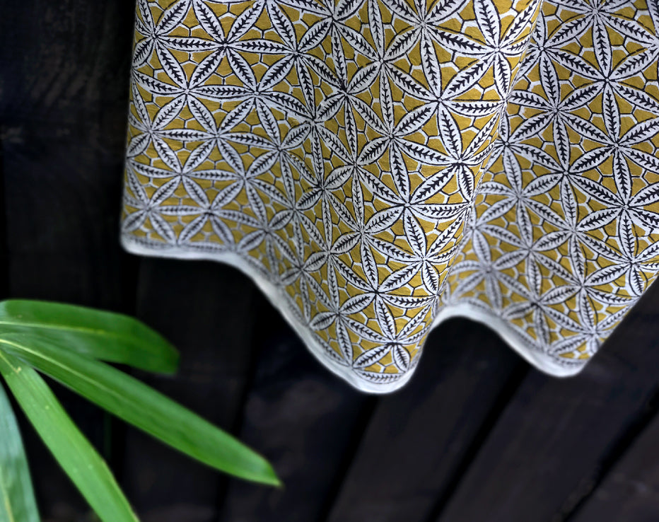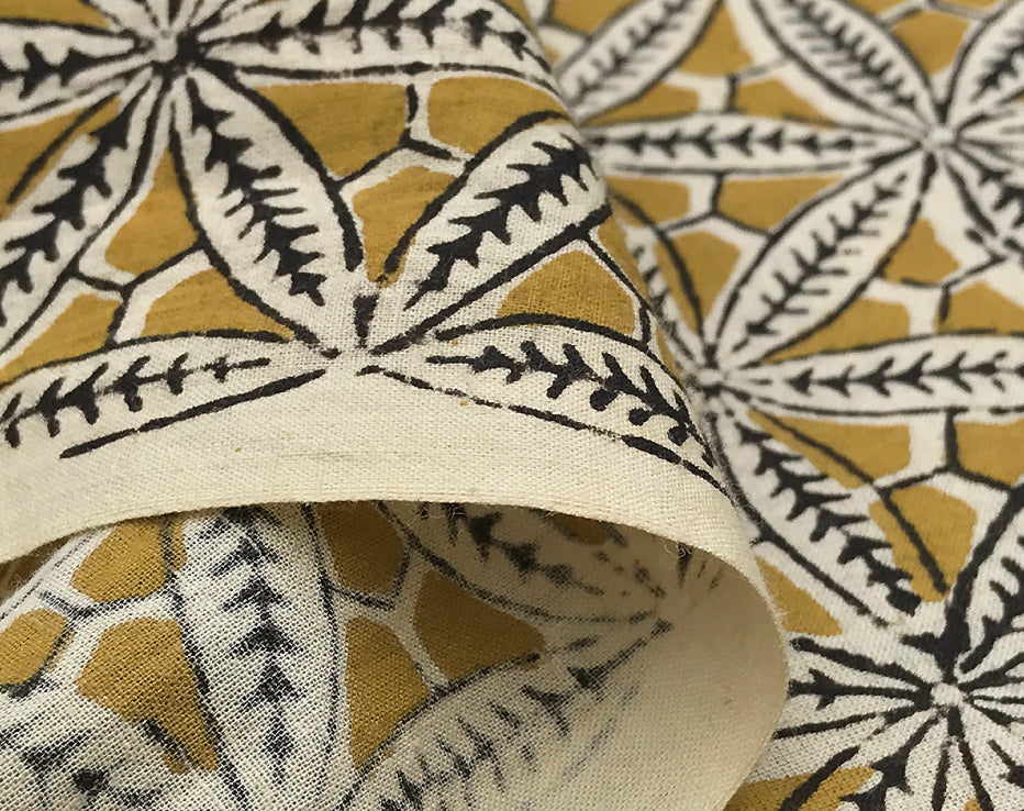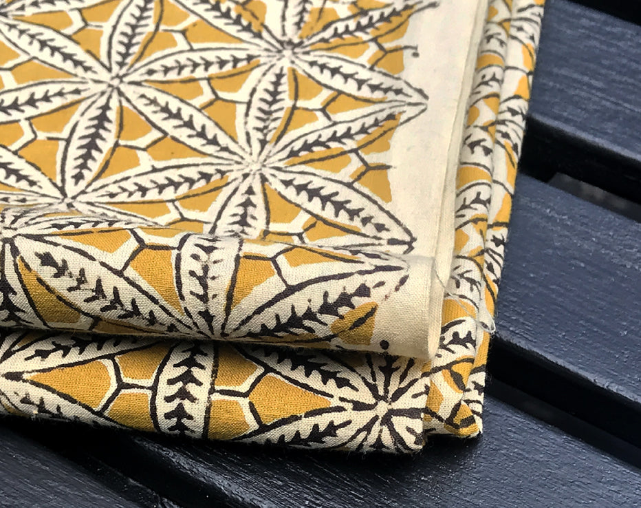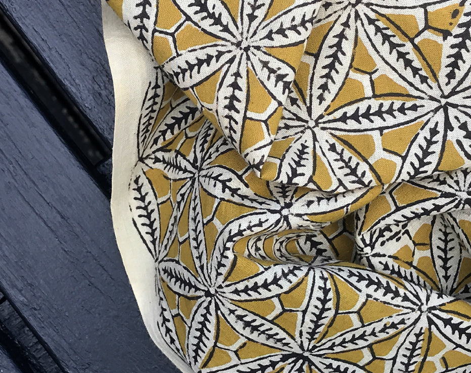 I searched for something a little more traditional from India and I think I've found it. A dreamy, soft and lightweight cotton print featuring a stunning repeat of pretty star floral shapes. These block prints only come in limited amounts so the styles are rarely repeated. The family-run textile businesses in India produce unique one-off designs using all plant-based dyes. Dried by the heat of the sun, these textiles produce colours have a different edge to a more commercially produced print, for instance, the black has a dark chocolate tone to it. This fabulous earthy shade of deep gold sits beautifully with this design.