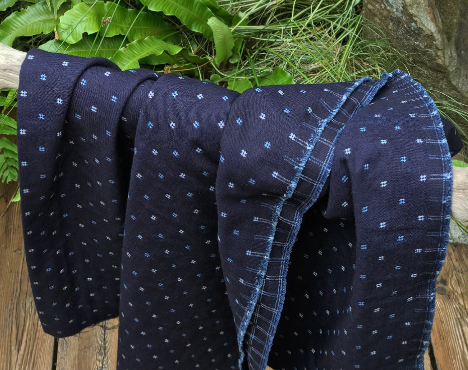 We have managed to acquire some beautiful fabrics from Thailand recently and I could not resist this luxurious 100% cotton that is double-faced. I find this so unusual I had just had to add it to our collection. This is two layers of indigo-dyed fabric stitched together and you can choose to use either side. Sourced from an expert denim supplier who has a close connection with textile mills in Japan and Thailand. I think this was originally produced for high-end shirt making. I love the geometric mini ikat design backed by an interesting woven check. These mills supply exclusive clothing brands that specialise in authentic styles, dedicated to timeless style.