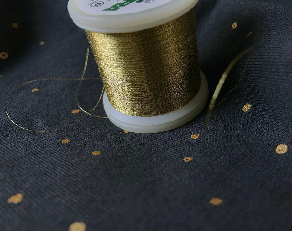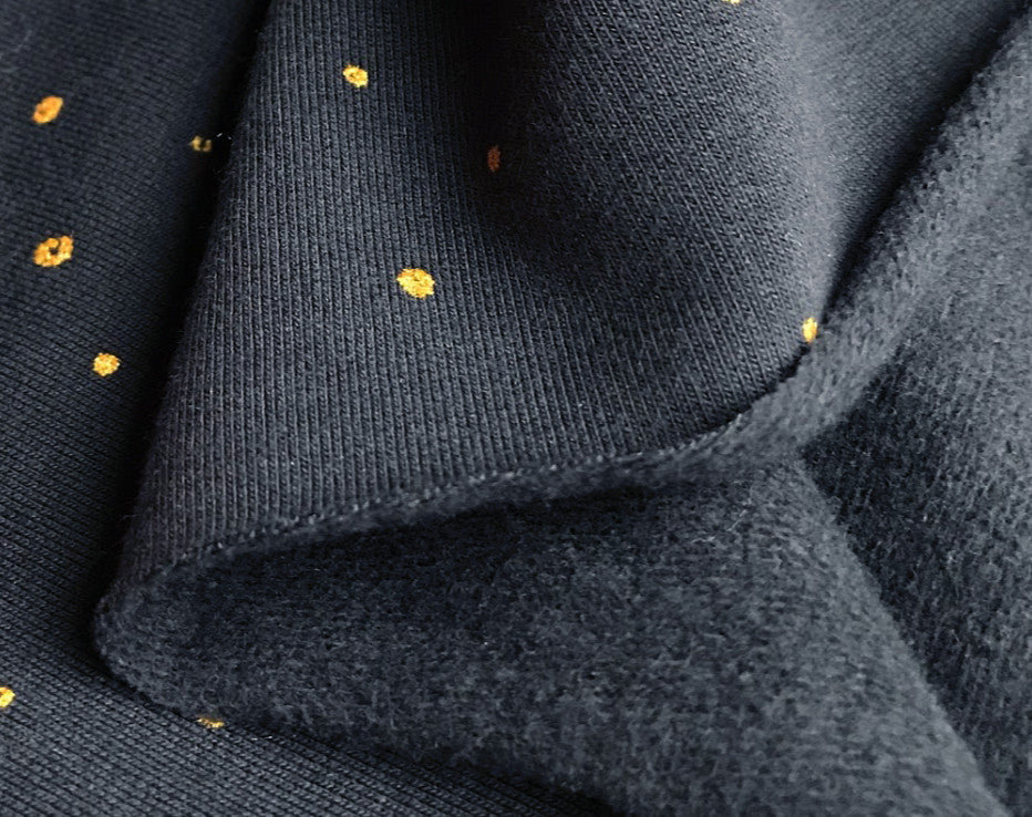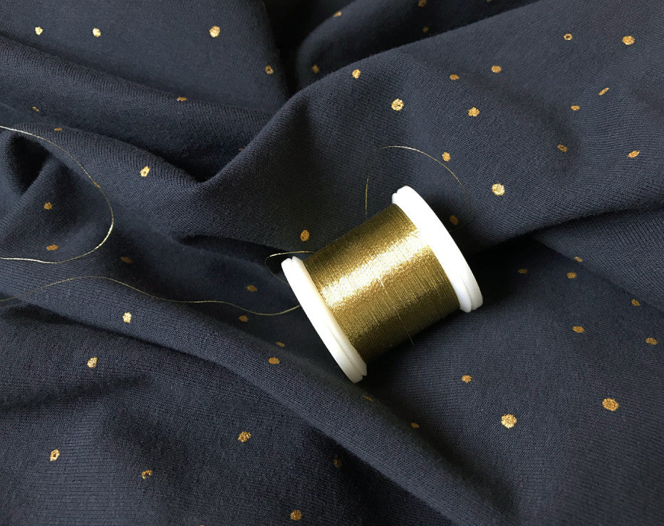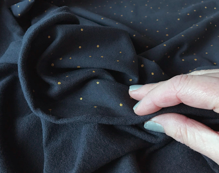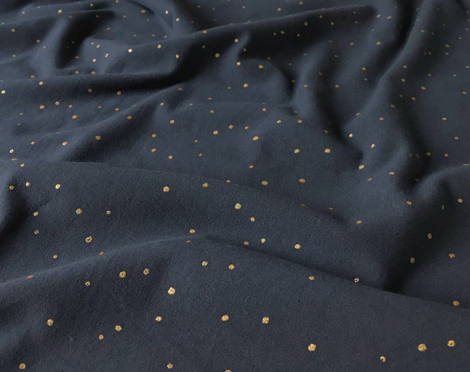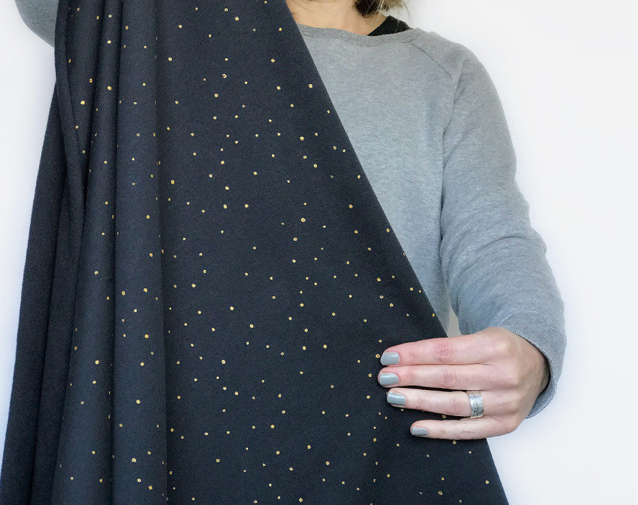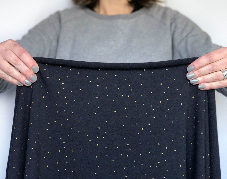 I think there's something to get quite excited about when a glittery ink is printed onto fabric! Welcome the new jersey range 'Twinkle' by Atelier Brunette, this, is all kinds of lush. A much loved brand based in France has always got something stylish, modern and minimal to offer and even better that they've now introduced jersey fabrics! Another thing I love about French fabrics is I like their use of colour and this is not your average navy blue. This cotton 'terry' style fabric is a gorgeous warm shade and the dots glisten like little stars. Being a light to medium weight sweat knit with a snuggly and soft backing, it will feel so cosy on, it has a fab weight and drape to it. Yes, I can expect, my teenage daughter and I may be possibly fighting over this one too! With knit fabric always pre-wash before use.